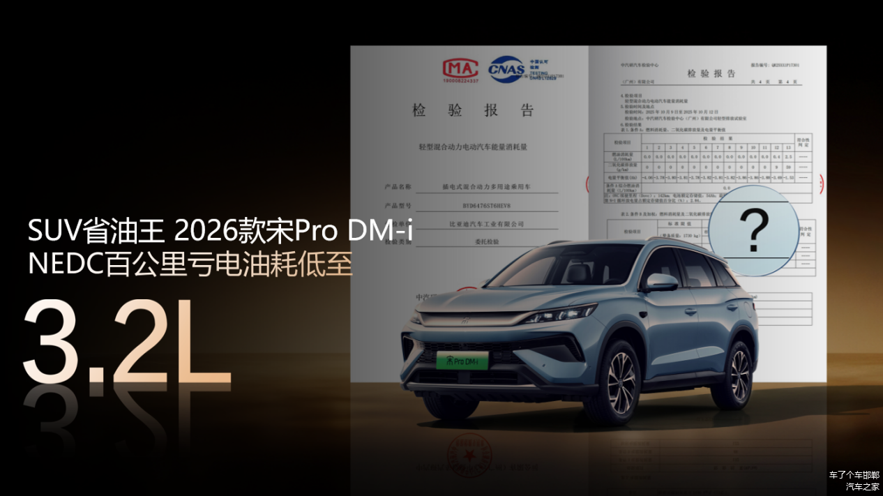 2026款宋Pro DM-i:百公里油耗低至3.2L,能耗再创新低