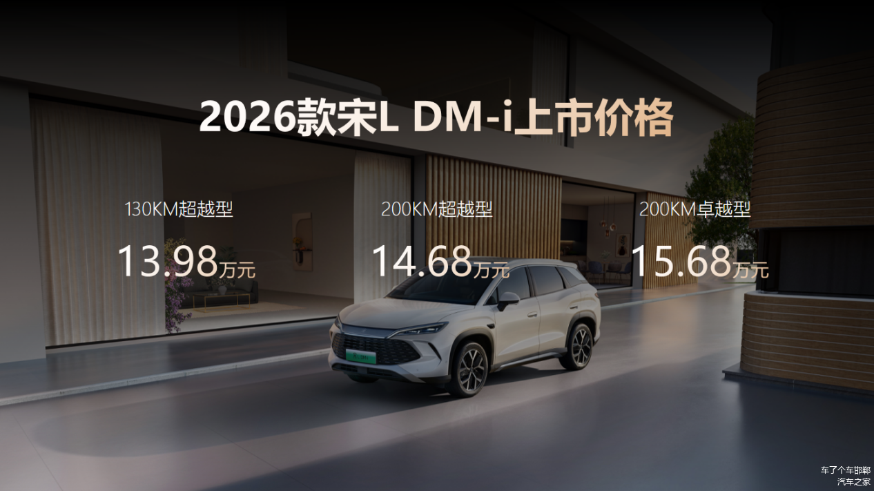 本次焕新上市的车型分别瞄准不同细分市场,第二代秦PLUS官方指导价7.98万元-9.98万元,2026款秦L DM-i官方指导价为9.68万元-10.68万元,2026款宋L DM-i官方指导价为13.98万元-15.68万元,2026款宋Pro DM-i的官方指导价为10.28万元-12.58万元。四款车以各具特色的产品魅力,满足用户从个人驾享到家庭出游的全场景需求。