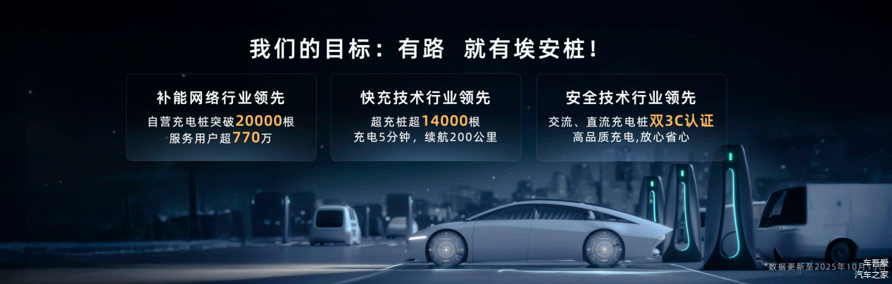 “国民好车”的价值,不仅凝结于产品,更体现在全生命周期的服务体验中。针对用户的“补能焦虑”,广汽埃安(广汽能源)正构建全国最强的补能生态,截止至10月15日,其自营充电桩已突破2万根,1000V快充桩数量位居行业第一,并与超过137万根互联充电桩共同组成“快广近”网络,朝着“有路就有埃安桩”的目标稳步迈进。