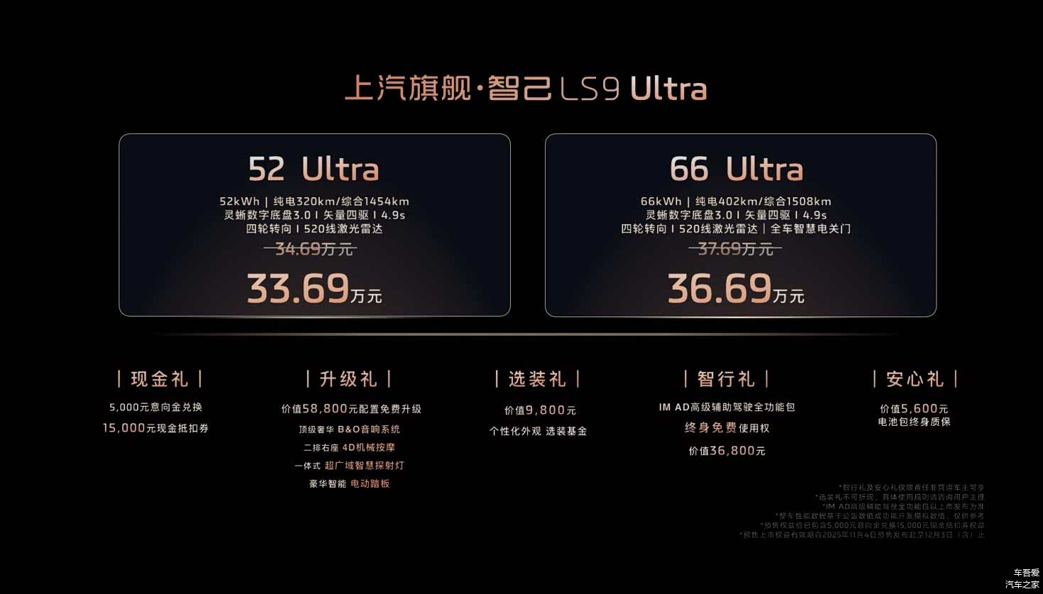 11月4日,上汽旗舰· 智己LS9(图片 | 参数 | 询价)全球首发并正式开启预售。新车重磅首发两个超级增程版本,全系皆Ultra:52 Ultra版,预售权益价33.69万元;66 Ultra版,预售权益价36.69万元。作为汇聚上汽集团70年造车底蕴,集全球顶尖技术打造的旗舰之作,智己LS9以“两大跨代际硬核科技+两大智能时代最强创新”的绝对实力,一举颠覆30万级大六座SUV市场格局,正式宣告9系新王诞生!