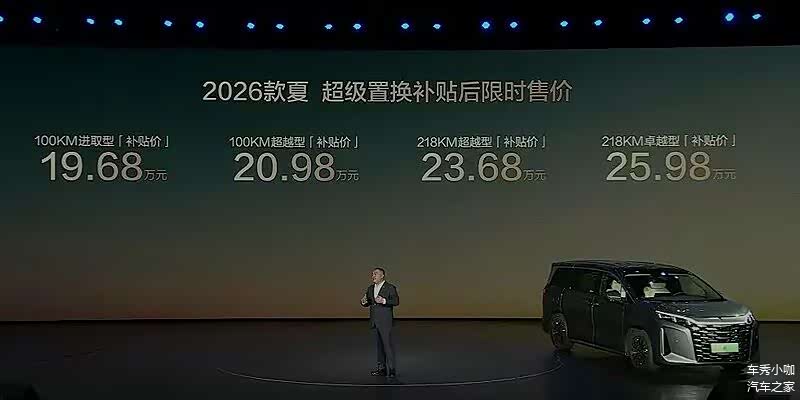 11月4日,2026款夏正式上市,新车共计推出4款车型,官方指导价为20.68-26.98万元,超级置换补贴后限时售价19.68-25.98万元。2026款夏换装了更大的电池包,其CLTC纯电续航从180km提升到218km,同时亏电油耗降低,配置进行升级。