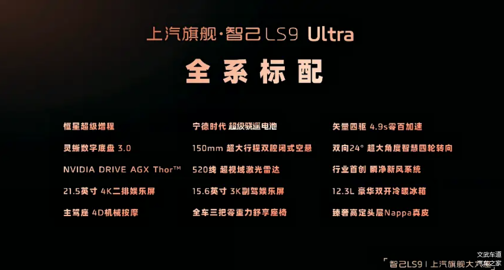 此外在配置方面,诸如二排大尺寸的吸顶屏、车载冰箱、 B&O音响系统、座舱清风系统和野奢户外套装等都进行了配备。在辅助驾驶方面,智己LS9还全系标配了520线激光雷达以及英伟达Thor辅助驾驶芯片。