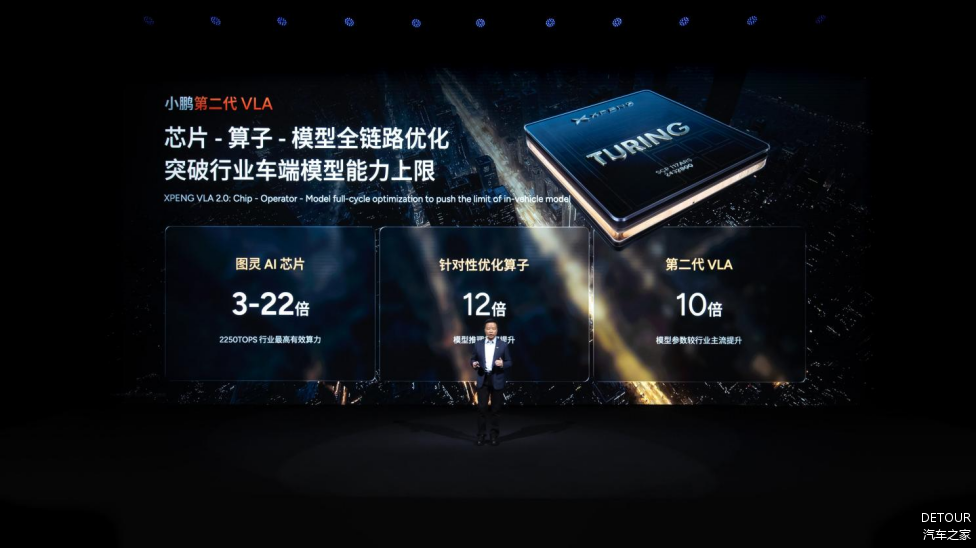 将小鹏第二代VLA部署到车端,极其考验软硬件协同和工程化落地的能力。为了实现第二代VLA量产上车,小鹏汽车针对图灵AI芯片重新开发了针对性的编译器和软件栈。得益于「芯片 - 算子 - 模型」全链路优化,小鹏汽车最终做到了在2250TOPS的Ultra版车型上,搭载数十亿级参数规模的第二代VLA,而行业普遍车端模型参数量仅为千万级规模。