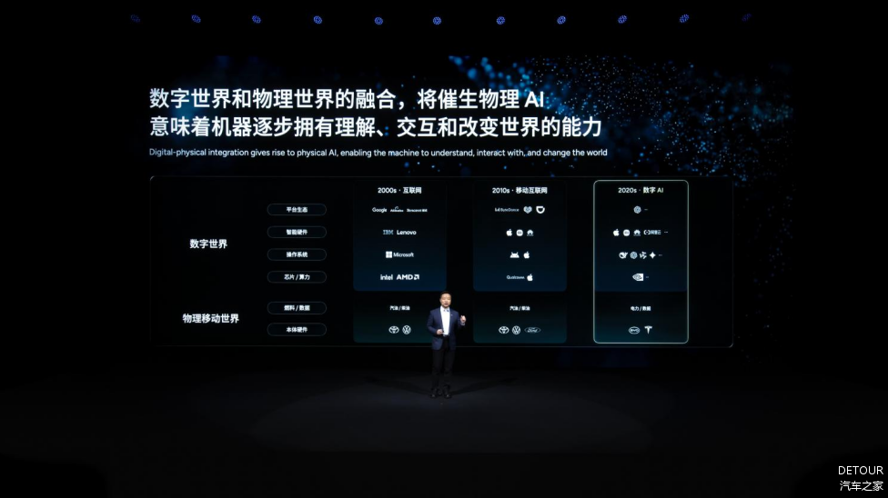 在发布会现场,何小鹏回顾了人类史上历次科技浪潮,并分享了他对科技浪潮的敏锐洞察:AI浪潮兴起,掀起了数字世界的全新革命。而在物理世界,电力取代石油成为主力燃料,新能源正在颠覆汽车百年工业。在他看来,当数字世界和物理世界融合,将催生“物理AI”。