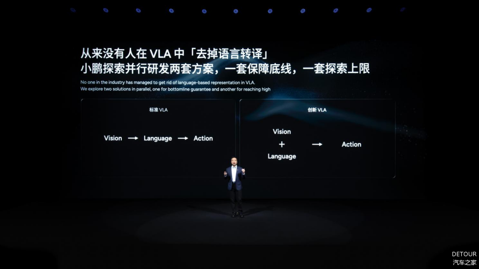 在何小鹏看来,未来大模型会成为“物理AI世界的操作系统”,也是一切物理AI应用的基础。在AI领域,“大算力+大数据+大模型”的组合,已被行业证实能让AI以超乎想象的速度演化并自我颠覆。本次科技日,小鹏汽车正式推出第二代VLA,创新性地去掉了“语言转译”环节,首次实现从视觉信号到动作指令的端到端直接生成,彻底颠覆了行业传统的「V-L-A」架构,探索全新物理模型范式。