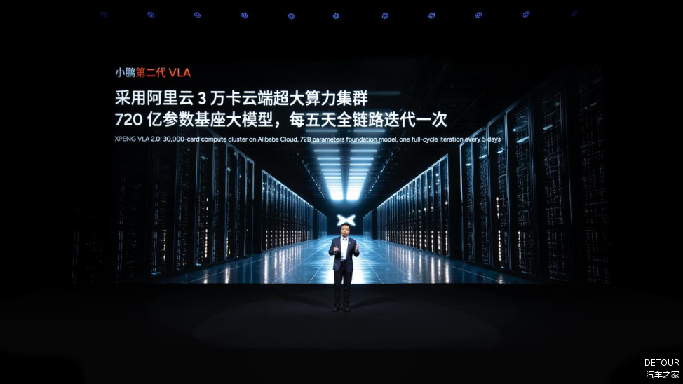 「大算力+大数据」的组合同样是云端大模型能力进化的核心驱动力,能够让大模型有更大的机率产生强大的智能涌现能力。小鹏汽车拥有全球领先的3万卡云端算力集群,集群运行效率常年保持在90%以上。并且,小鹏已在云端实现720亿超大规模参数的基座模型部署,该模型可实现每五天全链路迭代一次。