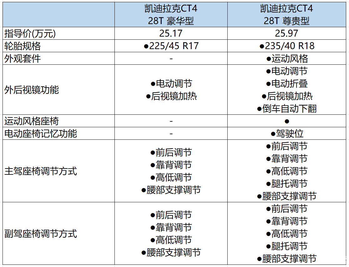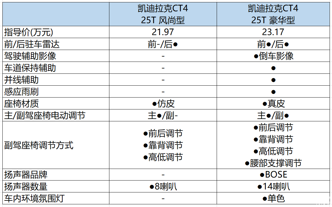 凯迪拉克CT4目前提供1.5T和2.0T两种动力版本,共四款车型配置,分别是25T风尚型、25T豪华型、28T豪华型和28T尊贵型。