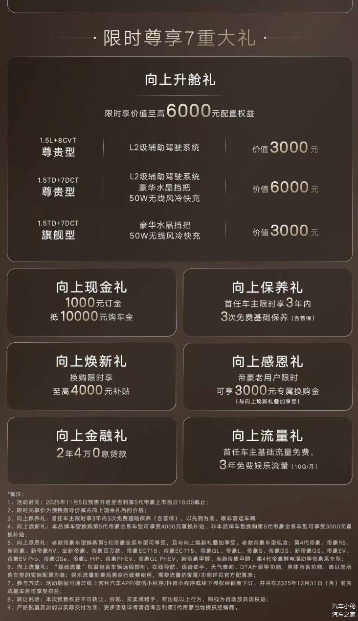 可以说,第5代帝豪用实实在在的硬核配置,将安全二字从一句口号变成了看得见、摸得着的安心保障。对于正在选车的家庭而言,抓住预售期的限时优惠,意味着能以更轻松的方式,提前锁定这份至关重要的出行安全感,迎接一个更加安心从容的有车生活。