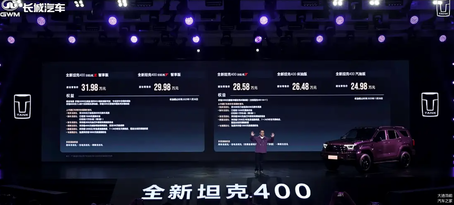 此次新款坦克 400 的升级可谓 “锦上添花”:在保持硬核越野能力这一核心竞争力的基础上,通过智驾、座舱、动力的全面优化,进一步降低了越野车型的使用门槛,让硬派 SUV 既能征战荒野,也能胜任日常通勤。对于追求个性与实用性的消费者而言,这款集机甲颜值、智能科技与强悍性能于一身的车型,无疑是极具吸引力的选择。