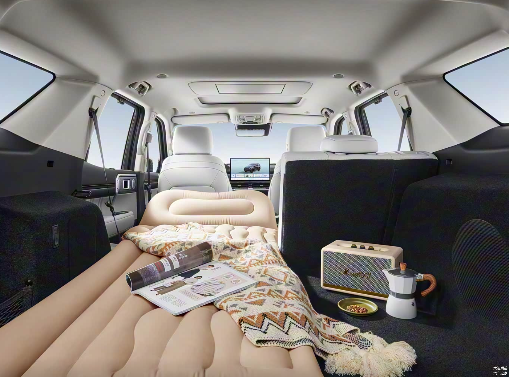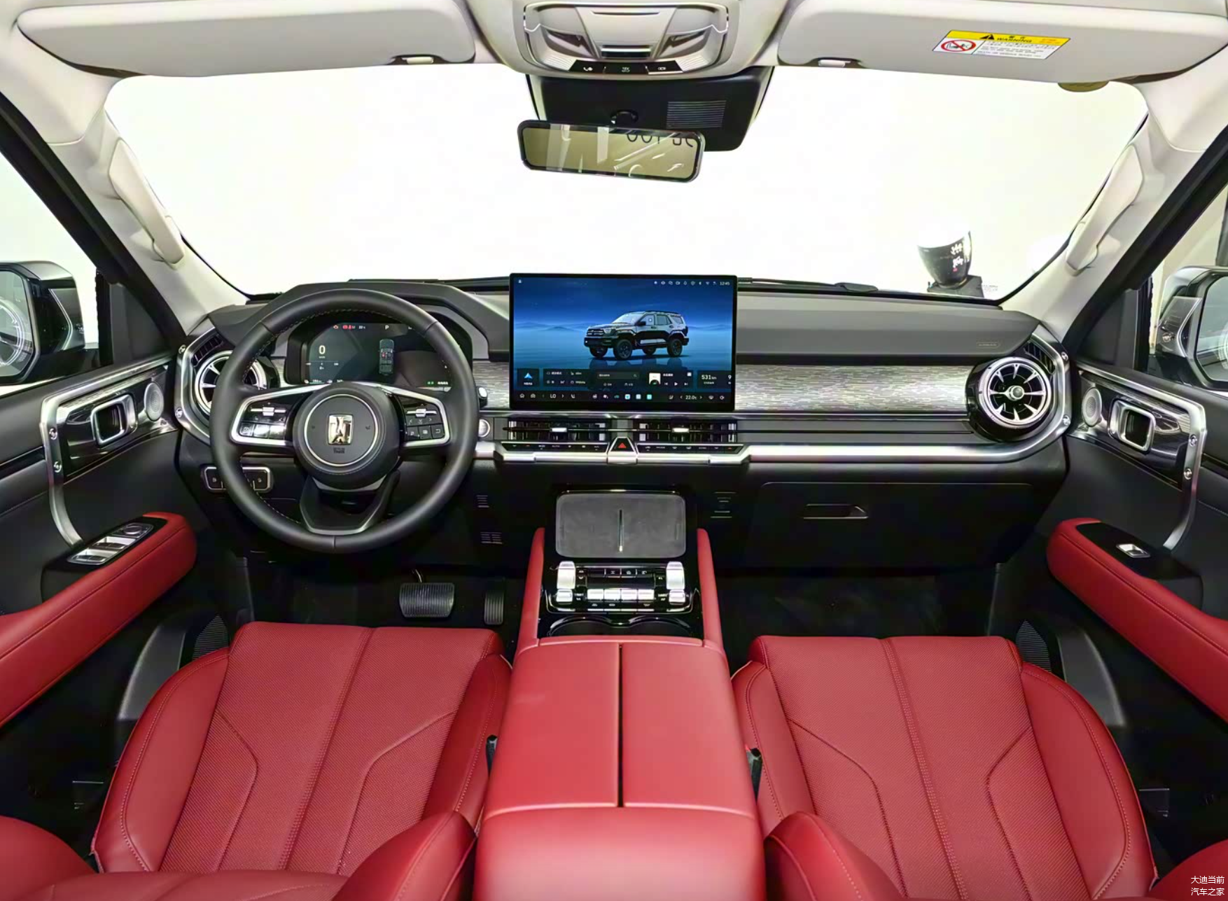 内饰的升级同样显著,提供永夜黑、星冕红、月影灰三种配色可选。换装怀挡设计后,副仪表台区域得以重新规划,依次布局双无线充电面板、金属质感越野控制区与双杯架,功能分区清晰,视觉上更显规整简洁。配置方面,新车凑齐了 “冰箱、彩电、大沙发” 的豪华套餐:前排扶手内置带独立压缩机制冷的冷暖箱,前后排分别配备 15.6 英寸 2.5K 中控屏与娱乐屏,让越野途中的乘坐体验更具舒适性与娱乐性。