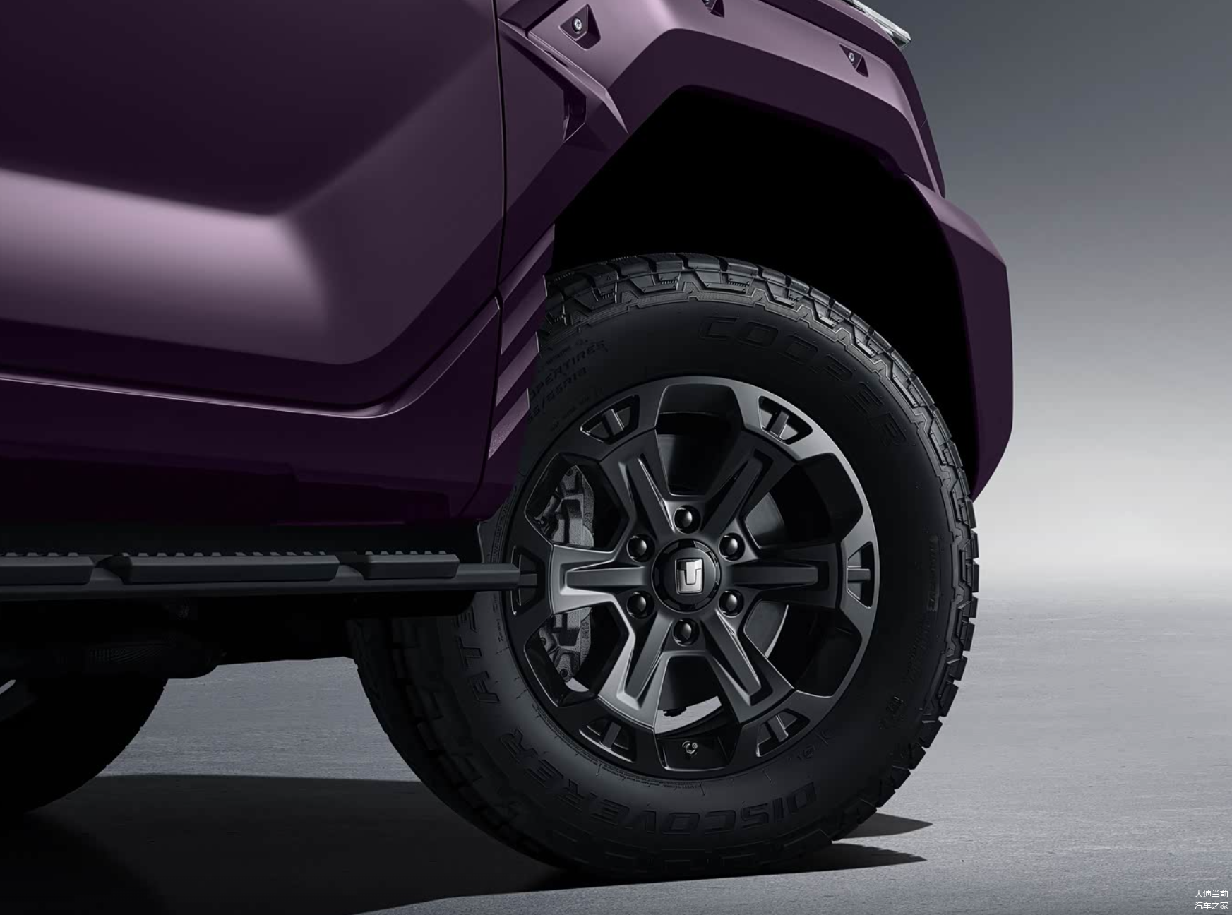 车尾部分,方正造型搭配外挂式备胎与外延尾灯,硬派气质不减。值得一提的是,新车在尾部新增辅助驾驶小蓝灯,既起到安全警示作用,又增添了设计巧思;简化后的备胎 “小书包” 让轮胎更多裸露,结构更简单,拆卸也更便利。