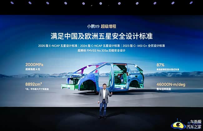 辅助驾驶系统方面,小鹏X9增程版将会搭载三颗图灵AI芯片,有效算力达到2250TOPS,其中两颗用于赋能辅助驾驶VLA大模型,另外一颗用于赋能智能座舱VLM大模型,其实际表现值得期待。新车采用了前后一体化压铸工艺,最高强度的钢板达到2000Mpa,整车扭转刚度达到46000N·m/deg,高强度笼型车身配合9安全气囊设计,为整车安全性打下了坚实基础。