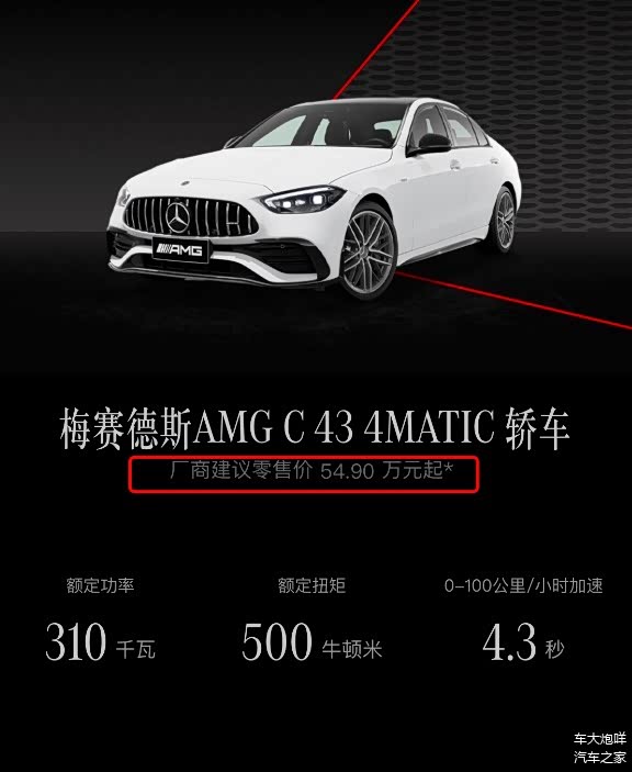 日前,笔者从梅赛德斯-奔驰官网获悉,2026款梅赛德斯-AMG C 43 4MATIC轿车(下称:2026款AMG C 43)现已上市,官方指导价由61.52万元变更为54.9万元。作为改款车型,2026款AMG C 43的动力性能没有变化,预计针对功能配置做出了调整,定价下调6.62万元。
