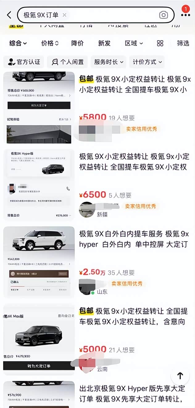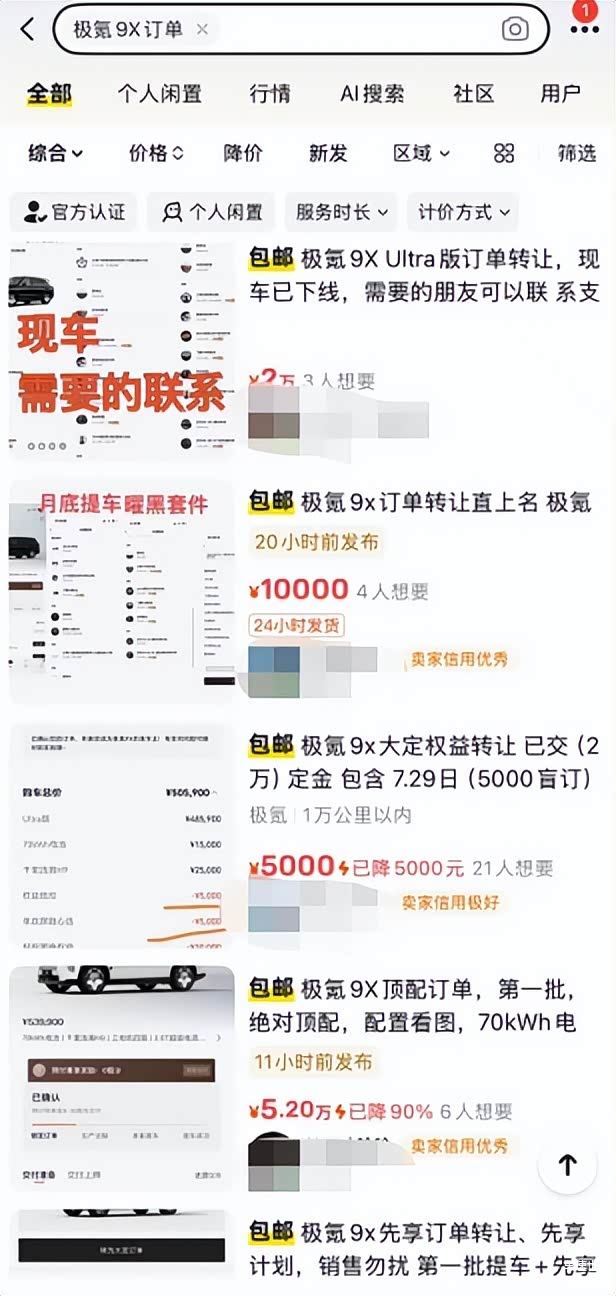 据了解,极氪9X的订单中,高配车型Hyper版与曜黑版的占比超过70%,受48V主动稳定杆这一中国品牌首次搭载的核心零部件产能影响,顶配版预计11月下旬才开启交付。记者在闲鱼等二手平台上看到,有用户为提前提车,愿意支付额外溢价,而早期大定订单的转让价格普遍在1-2万元,部分临近交付的订单报价更高达2.5万元。多名卖家标注“订单可更名”、“保留首批车主权益”,利用官方规则促成交易,形成活跃的二级交易市场,9X俨然已成大家追捧的理财产品。