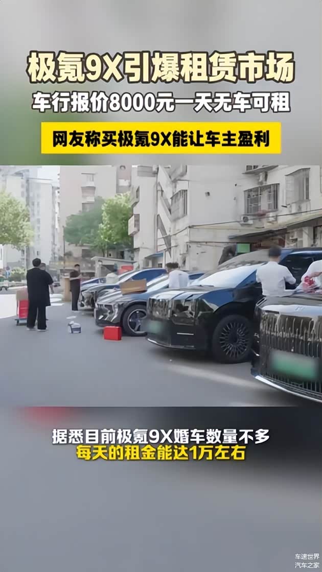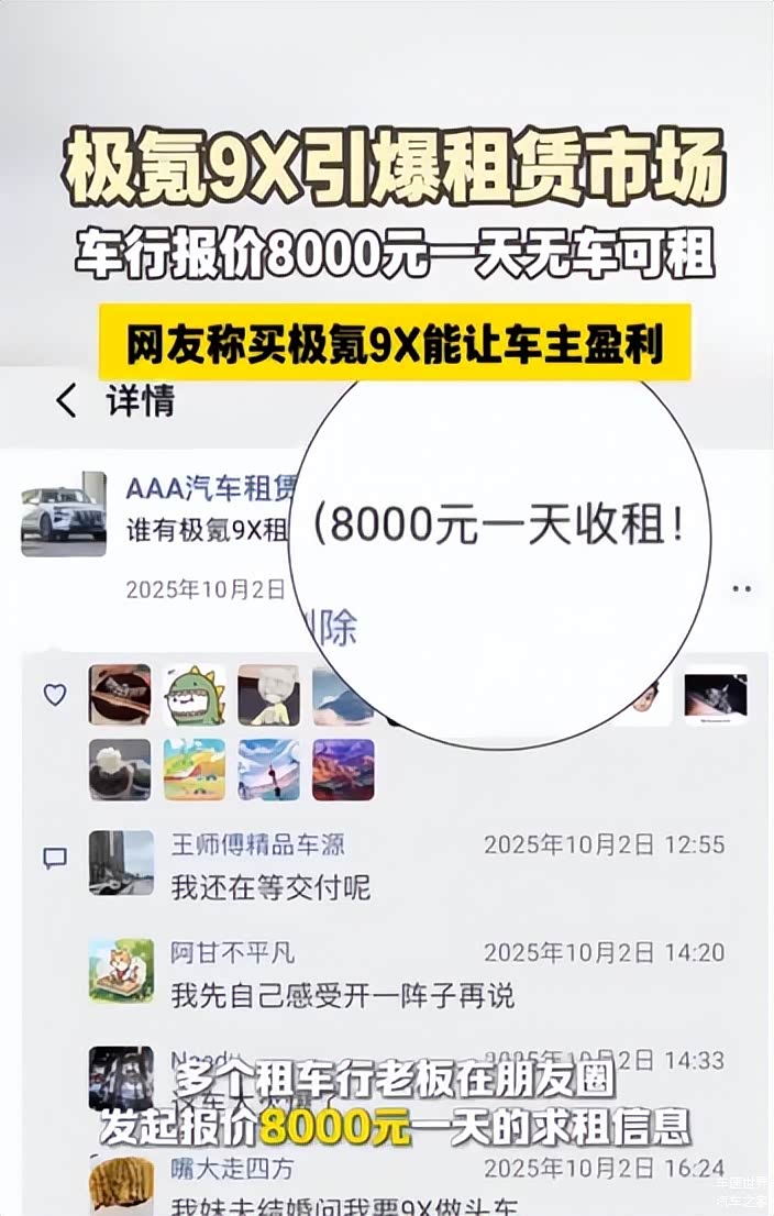 热度同样催生了高溢价的试驾租赁业务。作为极氪全球首款900V高压混动全尺寸SUV,极氪9X搭载宾利同源Naim音响、70度6C混动专用大电池、48V主动稳定杆及千里浩瀚辅助驾驶系统H9等多项首发技术,吸引大量BBA、路虎等传统豪华品牌车主关注。由于官方体验车源紧张、预约爆满,部分租车行推出日租金高达8000元的短期试驾服务,以满足迫切的市场体验需求。