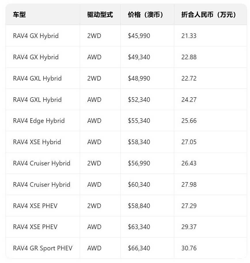 澳洲新一代RAV4仅提供油电动力,包含基本的2.5升油电与2.5升PHEV插电式油电,共有11款车型,2.5升油电可选择2WD与AWD车型,售价45,990~60,340澳币,折合人民币21~28万。 澳洲售价出炉也刚好对应到日前北美原厂透露RAV4门槛落在3万美元左右,折合人民币21.3万。