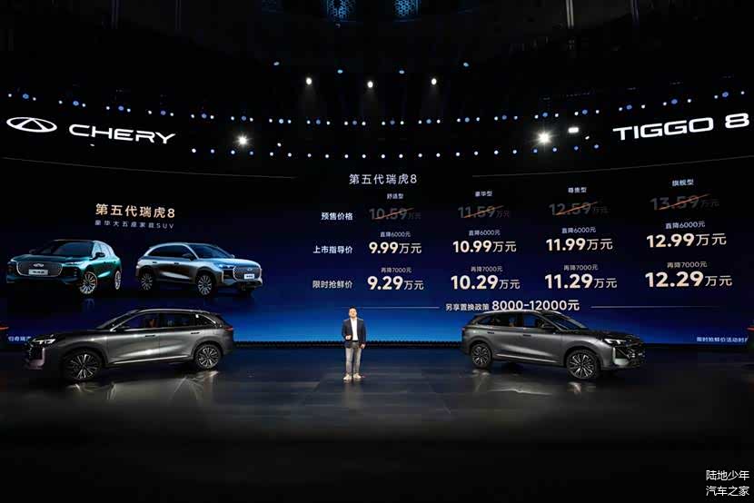 11月10日,自研旗舰 全球冠军——第五代 瑞虎8(图片 | 参数 | 询价)全球上市发布会于北京雁栖湖隆重举行。作为中国新燃油战略下的全新力作,新车集“硬核全能”的驾控实力与“电感体验”的智慧舒适于一身,为用户带来全面越级的驾乘感受,重新定义家庭SUV的价值标杆。第五代瑞虎8诚意推出8重冠军礼遇,限时抢鲜价9.29万元起,让消费者购车更轻松、用车更省心!