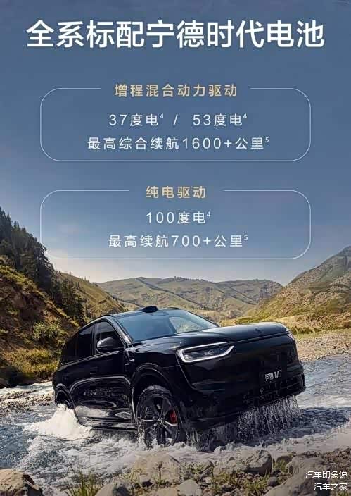 动力方面,全新问界M7增程版和纯电版同时发布。其中增程版搭载1.5T增程器,最大功率118kW,配备37kWh/53kWh电池,WLTC公告油耗6.5L/100km,最高综合续航超1600km。纯电版搭载华为七合一高压电驱,更小体积、更低重量、更高效率、更低噪音,并配备100kWh大电池,CLTC综合续航超700km。