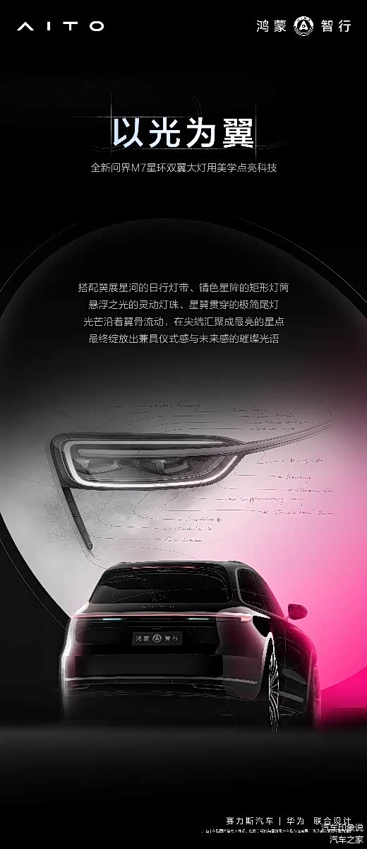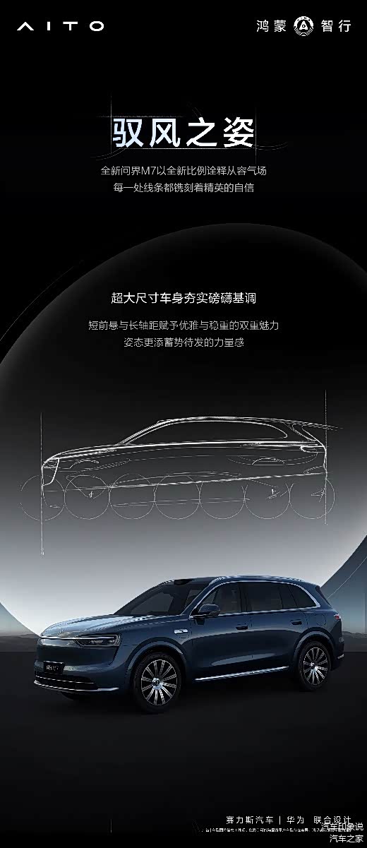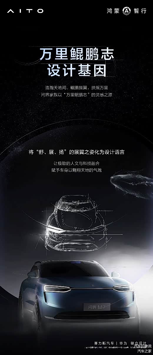 外观设计上,全新问界M7采用了家族设计语言,以“万里鲲鹏志”的灵感之源,将“舒、展、扬”的展翼之姿化为设计语言,让极致的人文与科技融合,赋予车身以翱翔天地的气魄。