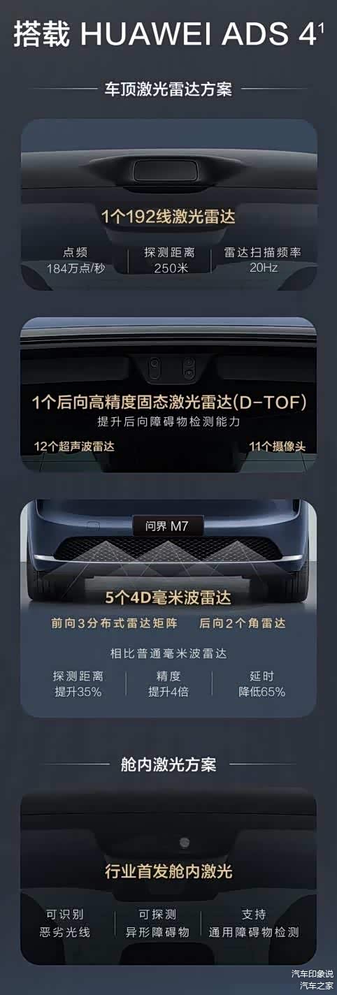 全新问界M7将搭载HUAWEI ADS 4辅助驾驶系统,提供舱内激光方案与车顶激光雷达方案两种配置供用户选择。车顶激光雷达方案配备192线激光雷达、后向高精度固态激光雷达、12个超声波雷达、11个摄像头,以及“3分布式4D毫米波雷达矩阵+2颗4D毫米波角雷达”共5个4D毫米波雷达等硬件,探测距离、精度都会提高,打造出更强大的辅助驾驶系统。行业首发Limera舱内激光方案,能识别通用障碍物,异形障碍物探测更准、恶劣光线下识别能力更强。