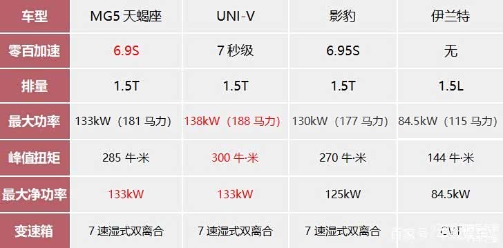 所以UNI-V也好、MG5天蝎座也好、影豹也好,都在强调“性能”。1.5T发动机搭配7速湿式双离合,三款车零百加速都能做到7秒左右。UNI-V就保守得很,虽然纸面参数上,它有着微微优势,但却只说7秒级加速,好在很多实测也印证了它的严谨性,所以大家没有对它口诛笔伐。而名爵有XPOWER团队,聊加速就相对来讲更有说服力,而且很多媒体测的MG6比官方数据更好!那影豹咱就不说了,懂得都懂对吧,被黑的主要原因可能是不太会运动化调校,却招摇过市。