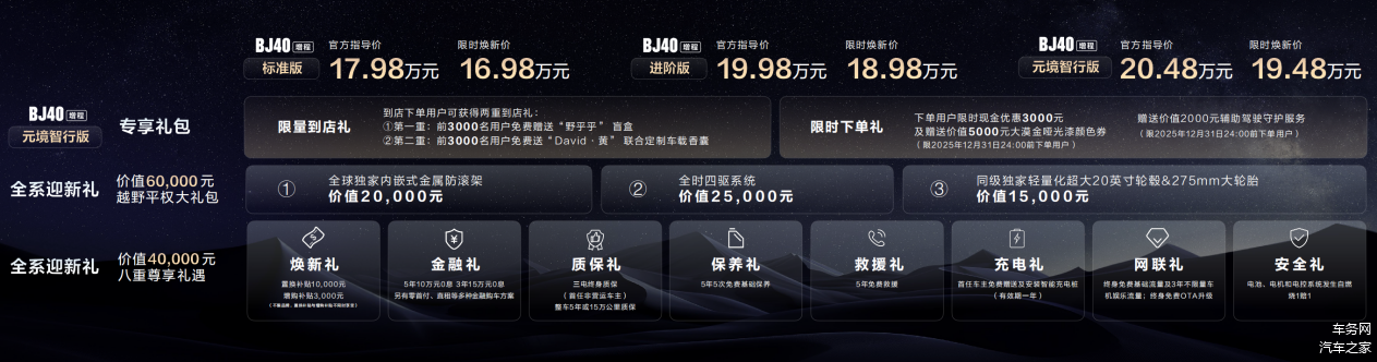 面对消费者,北京越野始终充满诚意。BJ40增程元境智行带来了两大全系迎新礼,BJ40增程标准版、进阶版、元境智行三个版型均能享受。