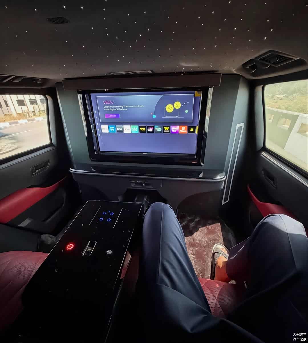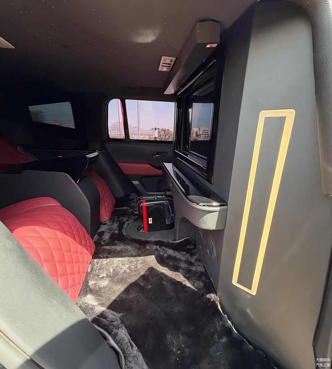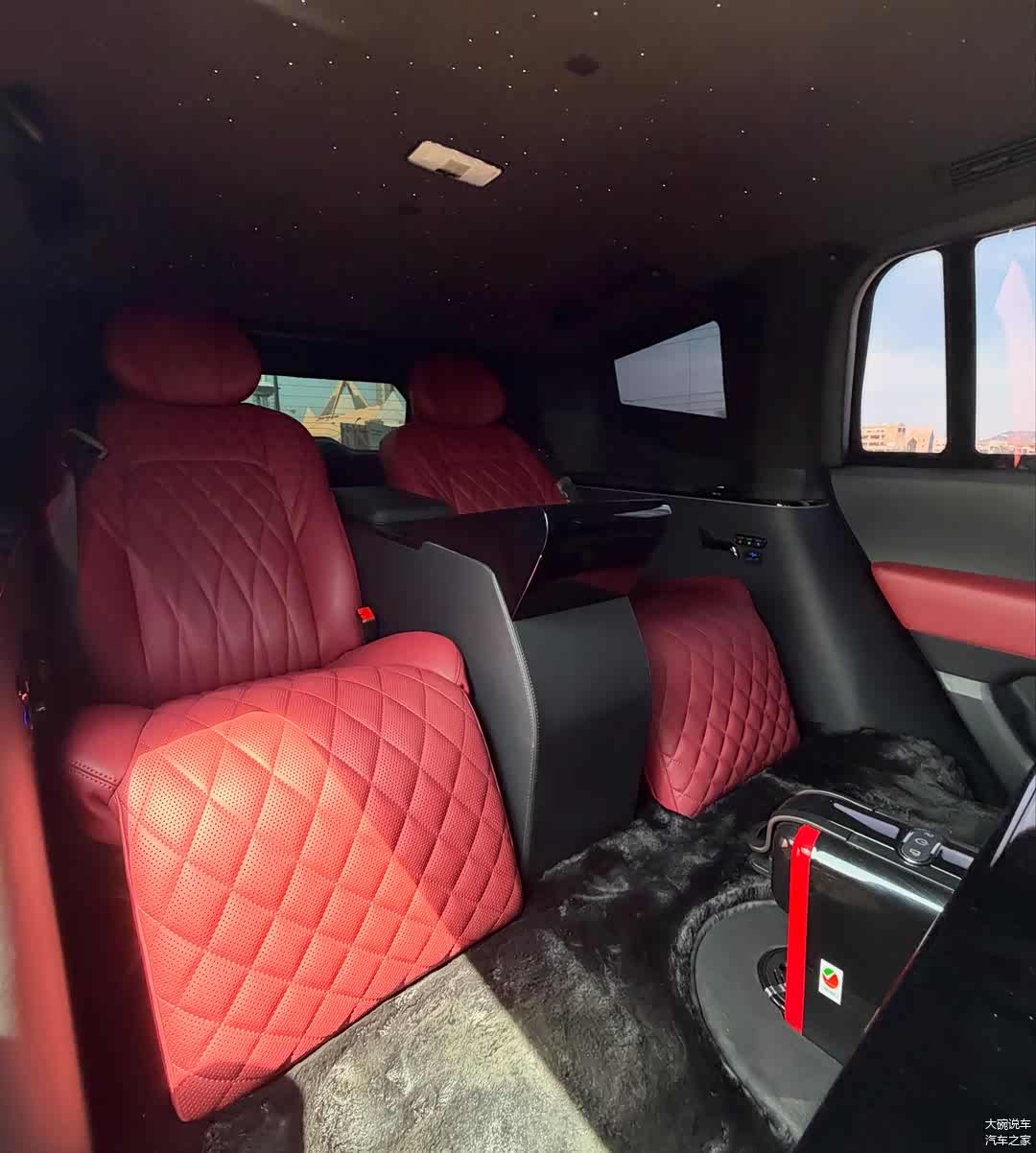 车内采用了四座的布局,空间很宽敞,后排座椅带有腿托的造型,后排带有尺寸较大的屏幕,并且和前排以及后备厢都是进行了隔断的设计,从侧窗可以看出,非常粗壮。