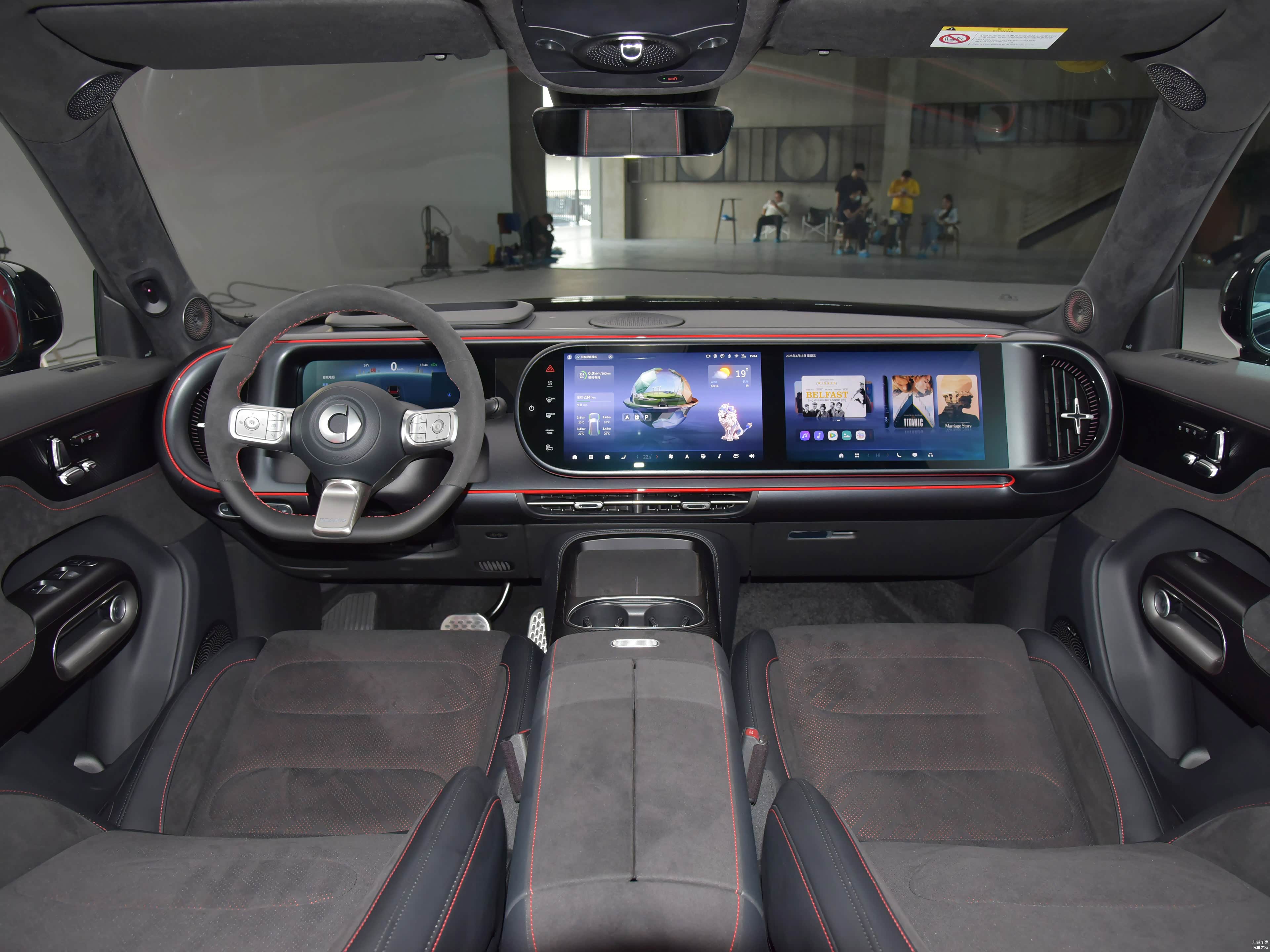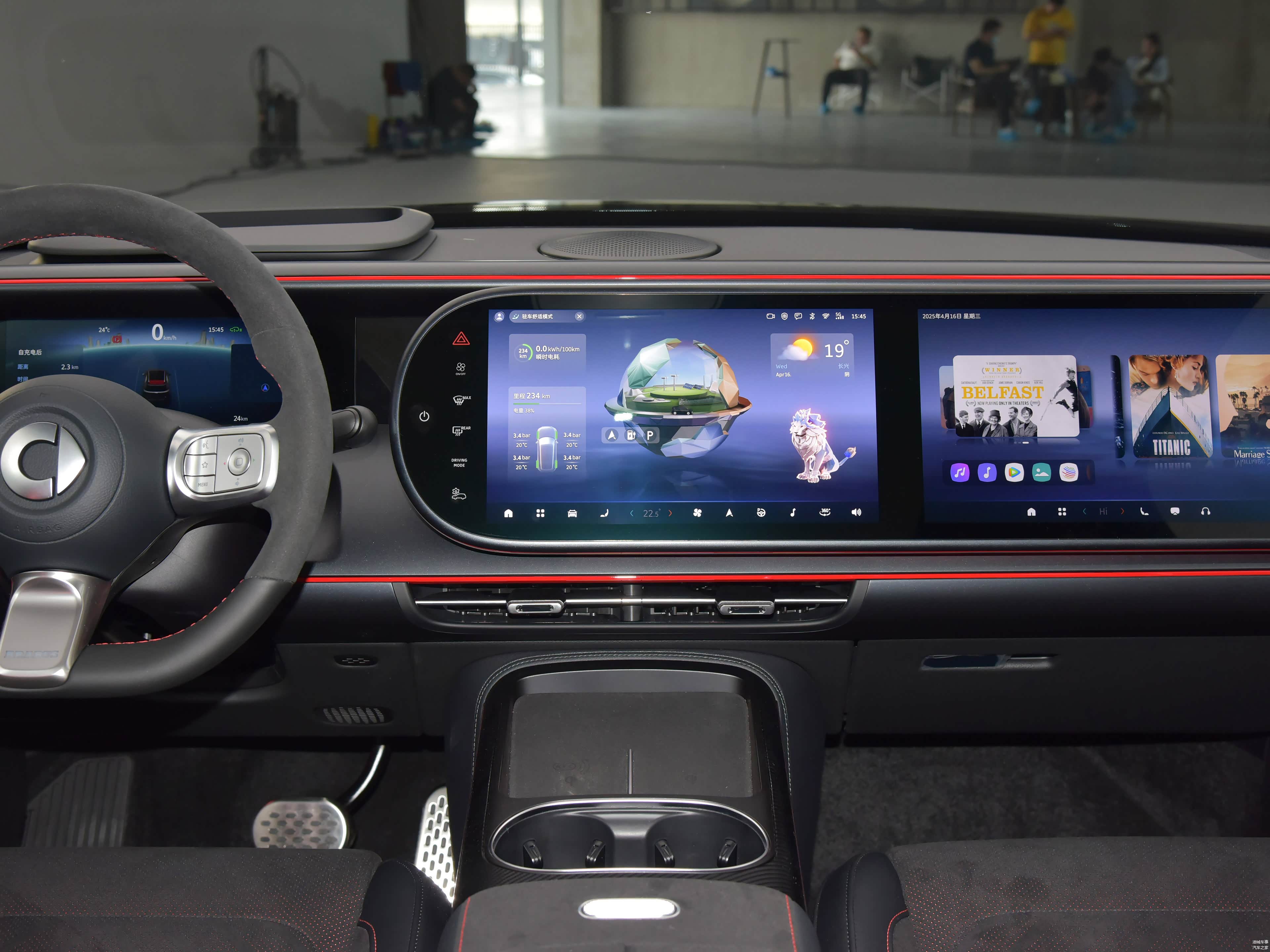 进入车内,精灵#5 EHD配备了10.3英寸全液晶仪表盘,并搭配双色三辐式多功能方向盘,整体内饰氛围年轻且科技感十足。更引人注目的是其搭载了25.6英寸AR-HUD增强型抬头显示系统,大幅提升驾驶信息读取的便捷性与安全性。中控区域则采用了悬浮式设计的双13英寸AMOLED超清2.5K联屏,显示效果细腻,操作流畅,整体布局与纯电版#5基本保持一致。