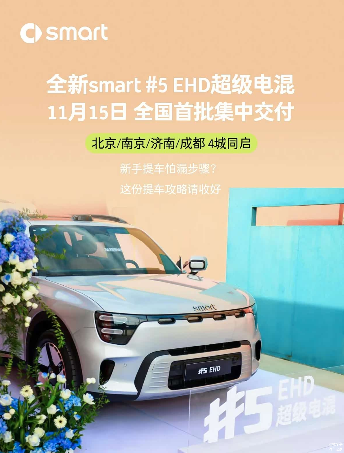 近日,据官方最新消息, smart精灵#5(图片 | 参数 | 询价)备受市场关注的smart品牌全新中型SUV——精灵#5 EHD插电混动版已正式启动全国范围内的首批用户交付。此次集中交付活动率先在北京、南京、济南及成都四座城市同步展开,标志着该车型正式进入市场销售阶段。新车此前已于近期宣布上市,共推出包括不同配置在内的4款车型,官方指导价格区间为18.99万元至23.99万元。作为 smart 品牌在插电混动领域的重要产品,精灵#5 EHD定位为中型SUV,搭载1.5T发动机与电机组成的插电式混合动力系统,并匹配高效的三挡DHT专用变速箱。其纯电续航表现突出,最大CLTC纯电续航里程可达252公里,极大满足了用户日常通勤及远途出行的需求。