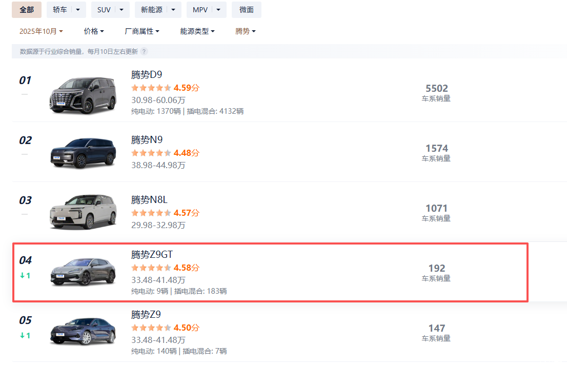 翻了一下上个月腾势品牌的销量构成,Z9GT这款车的表现的确惨不忍睹,10月份累计销量才192台,其中纯电车型仅占9辆。其实,把时间线拨回2024年,12月份它还有3565台的销量成绩,但2025年销量急转直下,上半年就只有3位数的月销量了。
