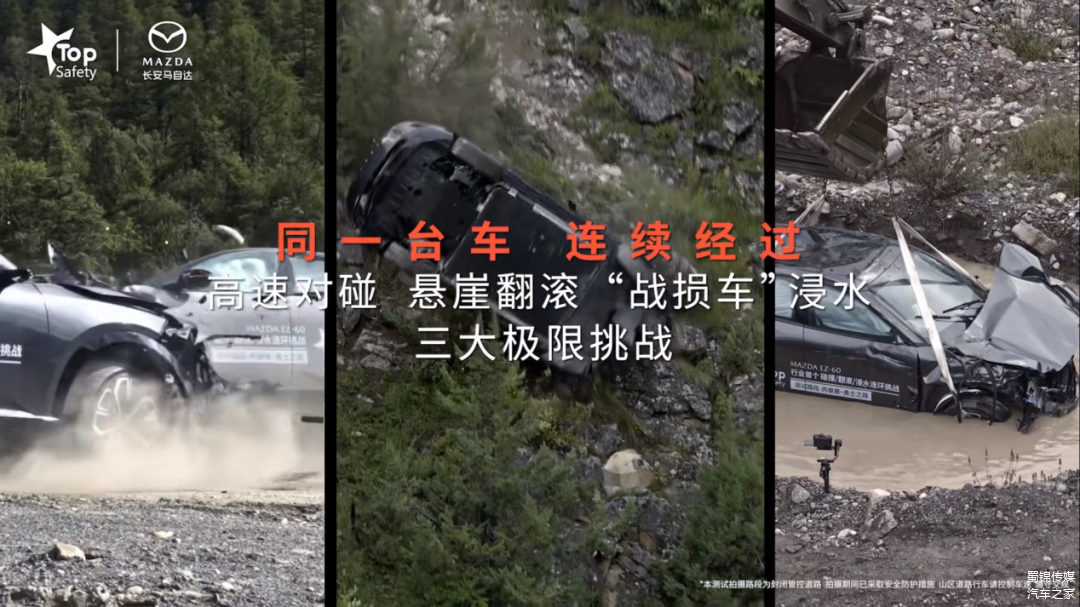 其实早在新车上市前,EZ-60就遵循马自达全球全场景验证和极端工况实测的传统,前往丙察察进行了“撞翻浸”三连实测。在110Km双车对撞测试中,EZ-60乘员舱无变形;在悬崖翻滚测试中,EZ-60电池无漏液;在实际极端环境下的电池半小时浸泡测试中,EZ-60的电池也无短路、无热失控。