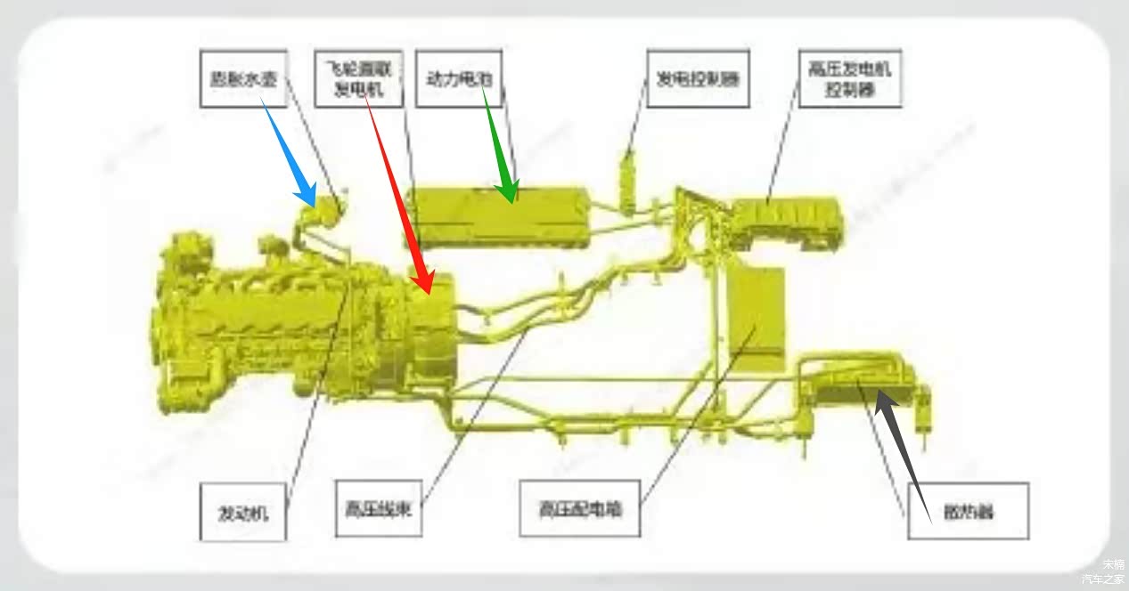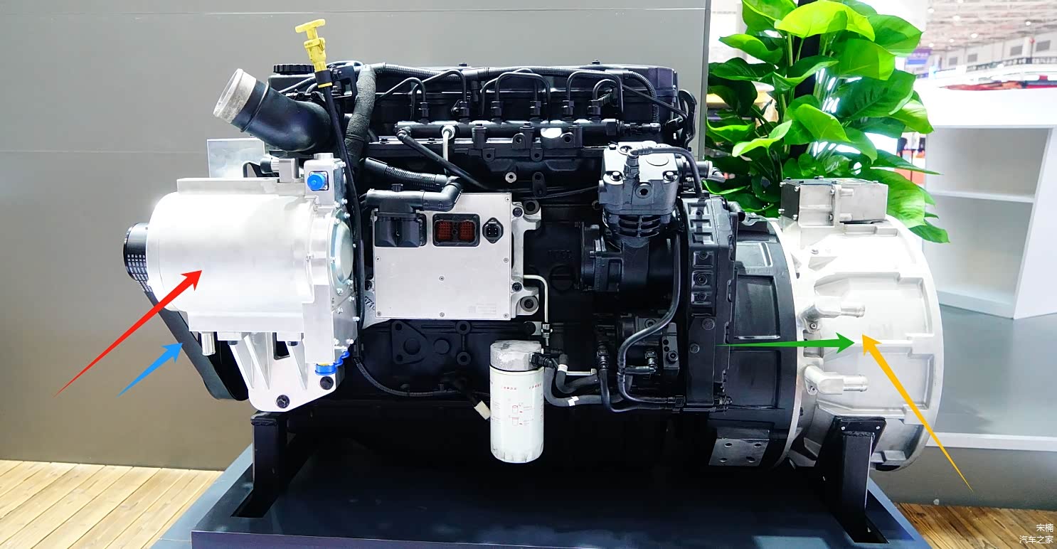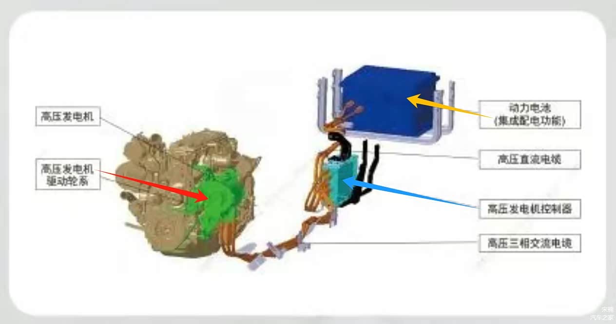ISG启发电机(黄色箭头)串联发动机后端中心,扭矩通过刚性直联方式传递并转化为700伏级电压、超60千瓦(或更高)的发电功率;