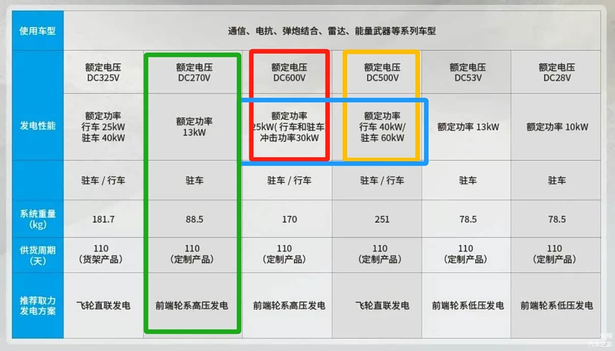 绿色区域,标注了一款较为轻量化的BSG启发电机,可以输出270伏额定电压、且额定驻车(怠速)发电功率13千瓦的数据。使用这款BSG强发电技术的载具,是不具备行车发电模式,如果适配在打无人机的载具端,似乎遂行“动对动”打击战术有些困难。