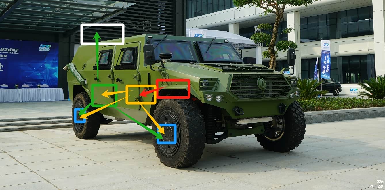 2021年的珠海航展的东风汽车展台,基于1代和2代猛士车族改型的多款装备,和基于1代猛士长轴距改型的民用M50等多个实车展示。除了整车,还有外挂BSG启发电机\串联ISG启发电机的纵置动力总成,以及某一款至今未公开亮相的新车型的电磁测试相关展板。东风汽车(军用猛士车族)应该是全球范围第一家,大规模量产满足第三方开发电子侦查、火力打击、通信指挥以及打无人机用的激光武器上装系统,载具端输出300-700伏级电压、25-60千瓦高压电的BSG\ISG强发电技术解决方案整车厂。