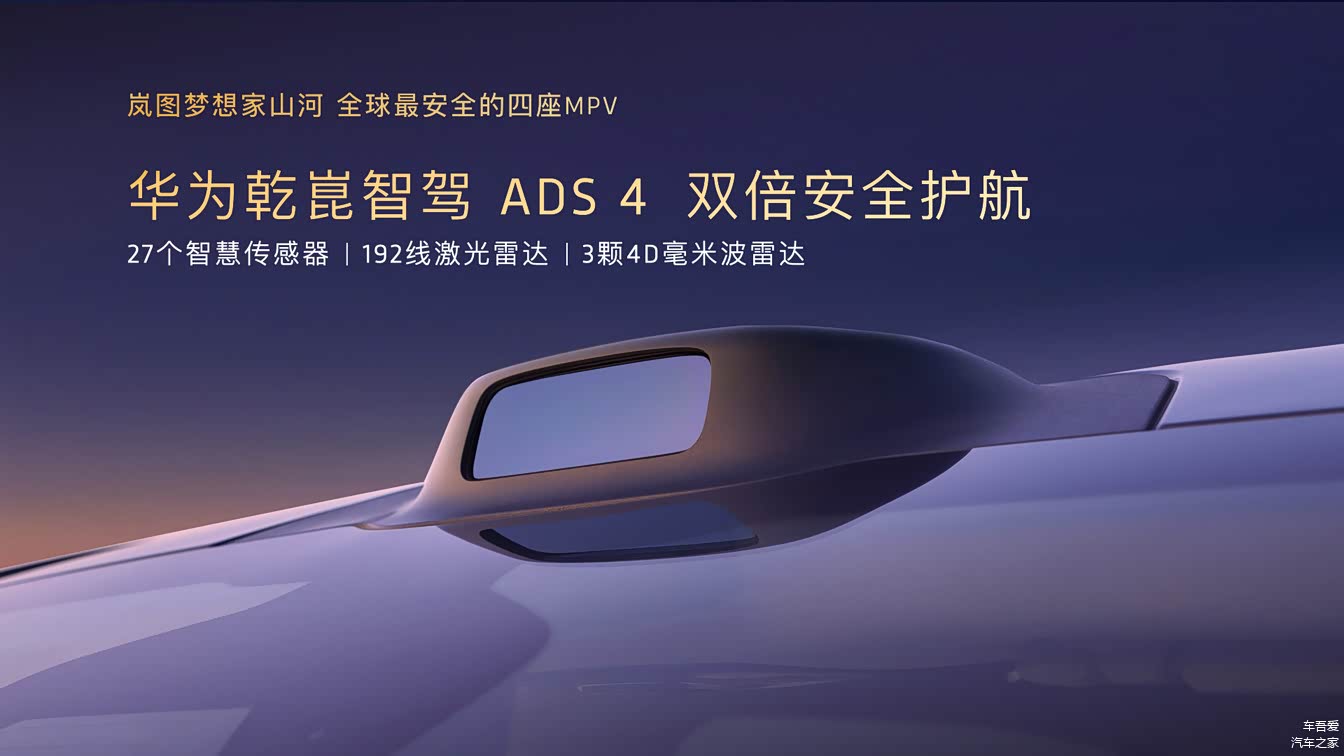 对于商界精英而言,安全从来不是“选择题”,是关乎家庭圆满、事业长青的头等大事。为解决传统四座MPV不够安全的痛点,岚图梦想家山河联合合作伙伴华为,以超一流的整车制造标准,打造全球最安全的四座MPV。新车搭载华为乾崑智驾ADS 4,硬件、架构和算法全面升级,集顶尖主动安全、被动安全、隐私安全、健康安全于一身,全面匹配商务精英的安全刚需,为用户带来“山河”永固般的安心保障。