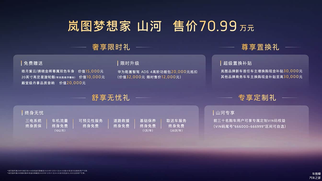 2025年11月21日,广州车展盛大启幕,“新时代旗舰四座MPV” 岚图梦想家(图片 | 参数 | 询价)山河正式上市,售价70.99万元。同步推出山河专属四重礼,包含皓月紫云/拂晓金辉尊属双色车身、20英寸高定星漩轮毂(带岚图悬浮徽标),及殿堂级丹拿品质音响;华为乾崑智驾ADS 4高阶功能包现金抵扣;超级置换补贴;专属定制VIN码权益;三电系统终身质保、车机流量终身免费、道路救援终身免费等权益。