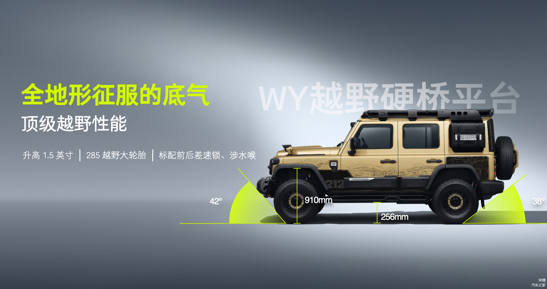 作为品牌焕新力作,T01高地传承经典“一拱、二圆、三横”设计元素,车身尺寸扩大强化硬派风格,专属“晨曦金”涂装搭配“高地纹”饰板及防滑侧踏板等拓展件。智能座舱采用军工风线条与金线勾勒,升级3D交互界面并支持QQ音乐等应用。越野性能上,基于WY硬桥平台打造,非承载式车身搭配285/70 R17轮胎,配备前后差速锁,实现42°接近角、38°离去角、910mm涉水深度及256mm离地间隙。安全方面,高强度钢占比达71%,A/B柱屈服强度1600Mpa,历经超百万公里路试(含高寒、高原等极端环境)。
