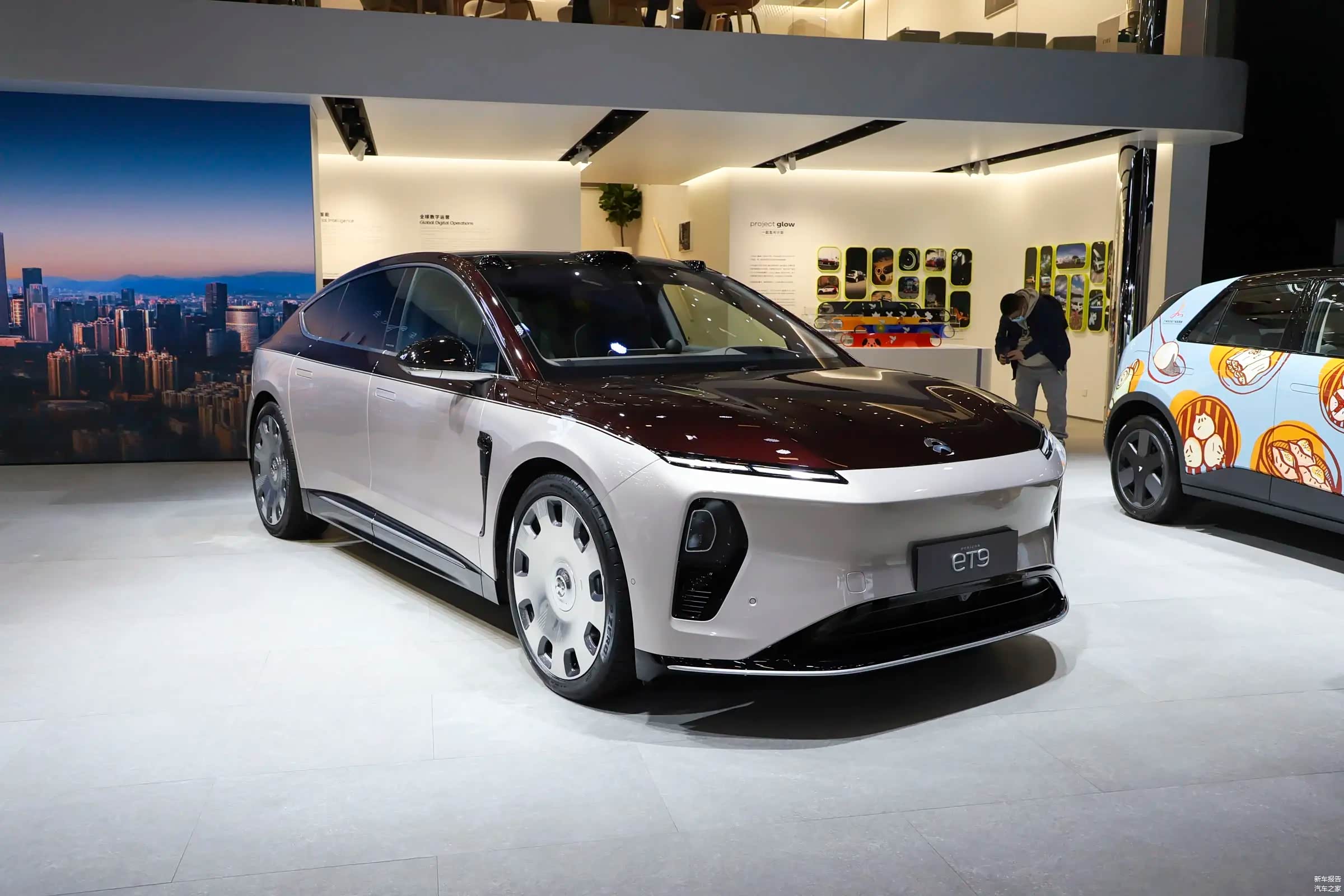 蔚来ET9地平线特别版的外观那叫一个个性。它采用了南极星蓝与月辉银的双色车身设计,灵感来自“天空之镜”乌尤尼盐湖的清晨,色彩与线条巧妙流转,营造出一种天地交融的视觉意境。车头是分体式大灯,搭配MicroLED智能高像素大灯,不仅照明效果好,还能防止来车远光灯的干扰。车顶的瞭望塔式传感器布局,加上双侧广角激光雷达,科技感直接拉满。车身侧面是大溜背造型,换装的23英寸“大饼式”轮毂搭配悬浮轮毂盖,气场十足。车尾的贯穿式尾灯集成240颗超红光LED光源,还有主动式可调后扰流板,运动感爆棚。