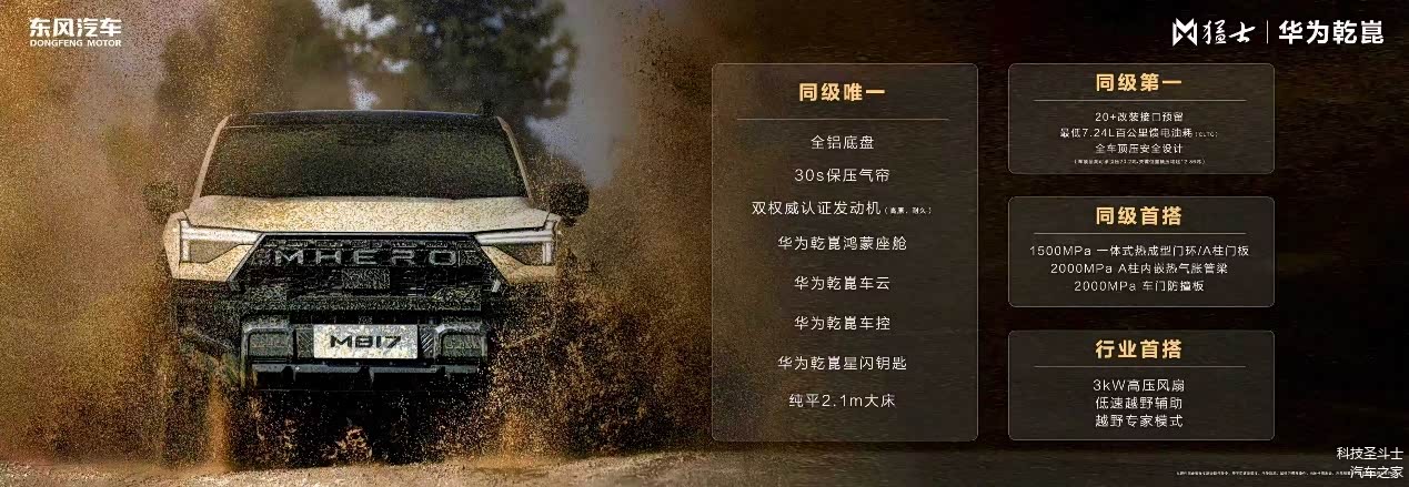 猛士M817 Hero版的到来,与在售的猛士M817 Pro版、Max版、Max+版组成更全面的智能越野产品矩阵,让猛士汽车“智野家族”实力再升级。猛士M817 Hero版以全域通达的硬核实力,让每一次远征底气十足;以华为乾崑赋能的智能科技,让每一段旅程安心从容;更以全能拓展的改装潜力,让每一个梦想的改装方案都能照进现实。