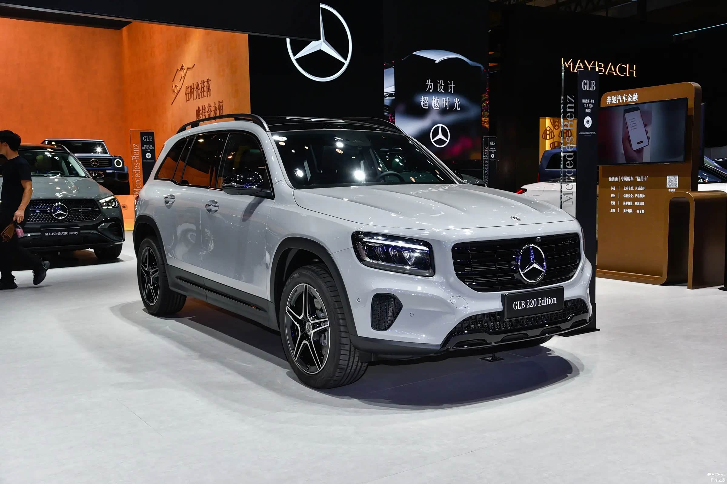 奔驰GLB典藏版走的是“运动潮男”路线,刚一亮相就靠黑化套件吸睛无数——黑色的中网、深色隐私玻璃,连车顶行李架都是黑色的,搭配专属的远峰灰车漆,低调又有质感。19英寸的五辐轮毂做了双色处理,加上立在车头的三叉星标,气场直接拉满,开在路上辨识度绝对够高。