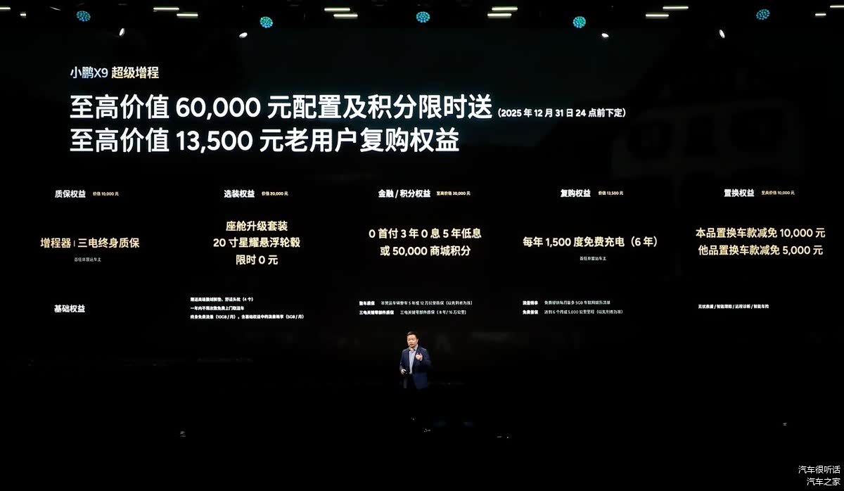11月20日,全球续航最长大七座—— 小鹏X9(图片 | 参数 | 询价)超级增程正式上市!新车共推出Max版和Ultra版两个版本,官方指导售价分别为30.98万元和32.98万元。小鹏汽车同步推出多重上市权益及丰富购车礼遇:即日起至2025年12月31日24点前下定,可享受至高价值60000元配置及积分权益:增程器和三电系统终身质保权益价值10000元;座舱升级套装+20寸星耀悬浮轮毂选装权益价值20000元限时免费;0首付3年0利息5年低利息金融权益或50000商城积分权益至高价值30000元。更有老用户还可享受至高价值23500元的复购权益:每年1500度免费充电6年有效期的复购权益价值13500元;本品置换车款减免10000元和他品置换车款减免5000元。