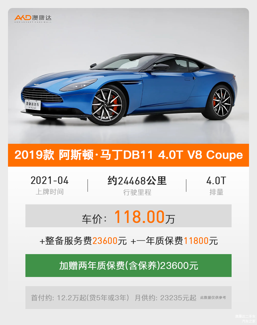 绝美英伦跑车的典范,也就是阿斯顿·马丁,必会是很多人的Dream Car,不过几百万的价格也并非能够“人均一台”,但像澳康达二手车在售的这台2019款 阿斯顿·马丁DB11 4.0T V8 Coupe,2021年上牌行驶约2.4万公里,118万就能入手了,真的就是“近在咫尺”!追求个性与品味的朋友选它极为合适!