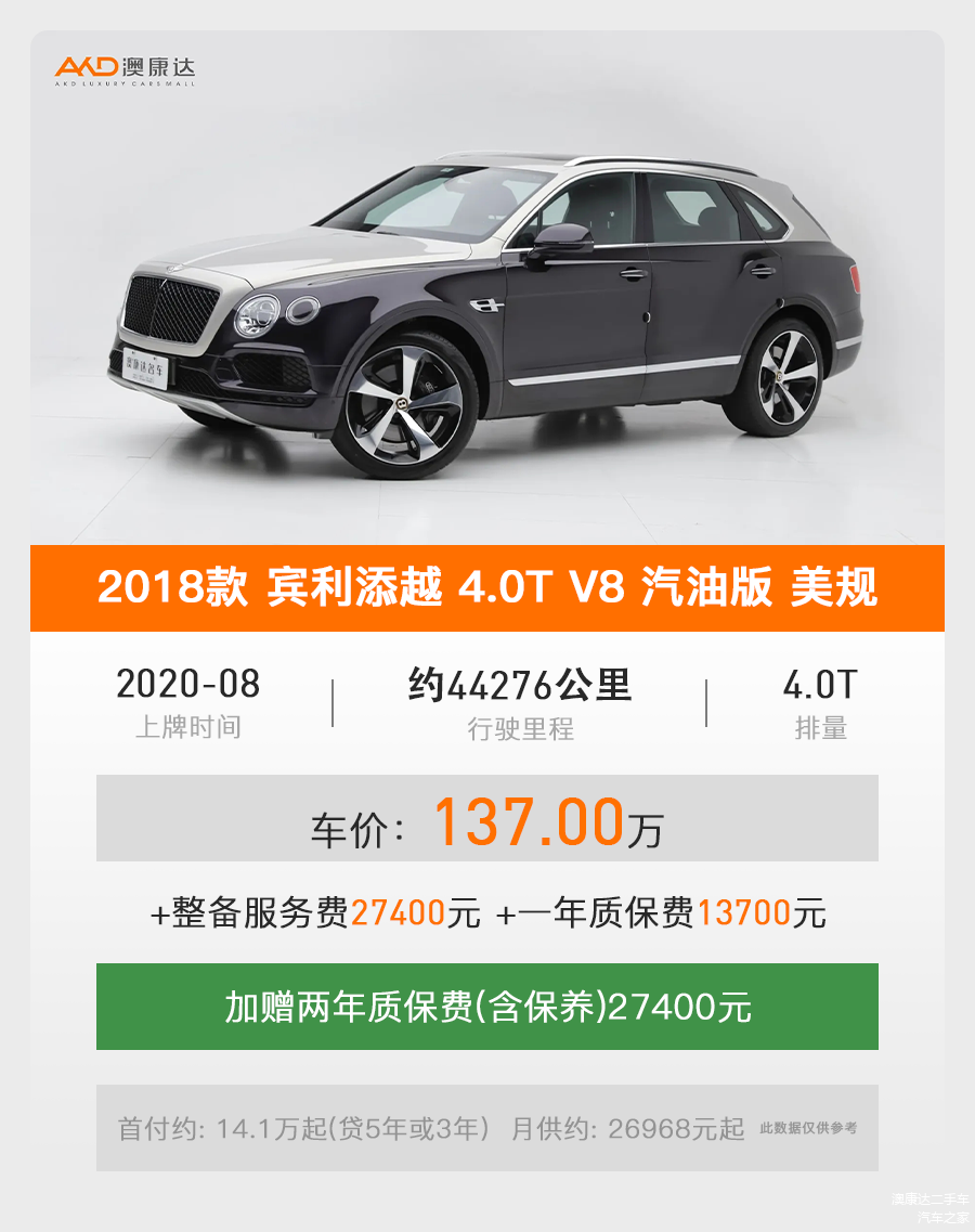 进入车内,你才会明白“宾利”二字的重量。手能触及之处,不是顶级真皮就是实木与金属,这台还选了双色菱形座椅以及舒适配置,更尊贵。动力上则是4.0T V8发动机,550马力、4.5秒加速,是底气亦是实力,驾控层面真兼顾舒适与运动了。像这辆2020年上牌的添越行驶约4.4万公里,目前不过137万而已!
