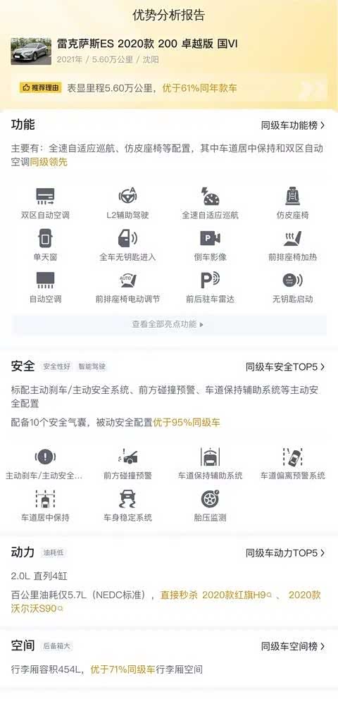 配置上,雷克萨斯ES 2020款 200卓越版国VI配备了全速自适应巡航、双区自动空调等高级配置。同时,该车在车道保持功能上表现突出。安全方面,车辆配备了主动刹车、前方碰撞预警、车道保持辅助等主动安全系统,以及10个安全气囊,被动安全配置优于大多数同级车型。综合来看,这款车型在各方面表现均衡,具有较高的性价比。