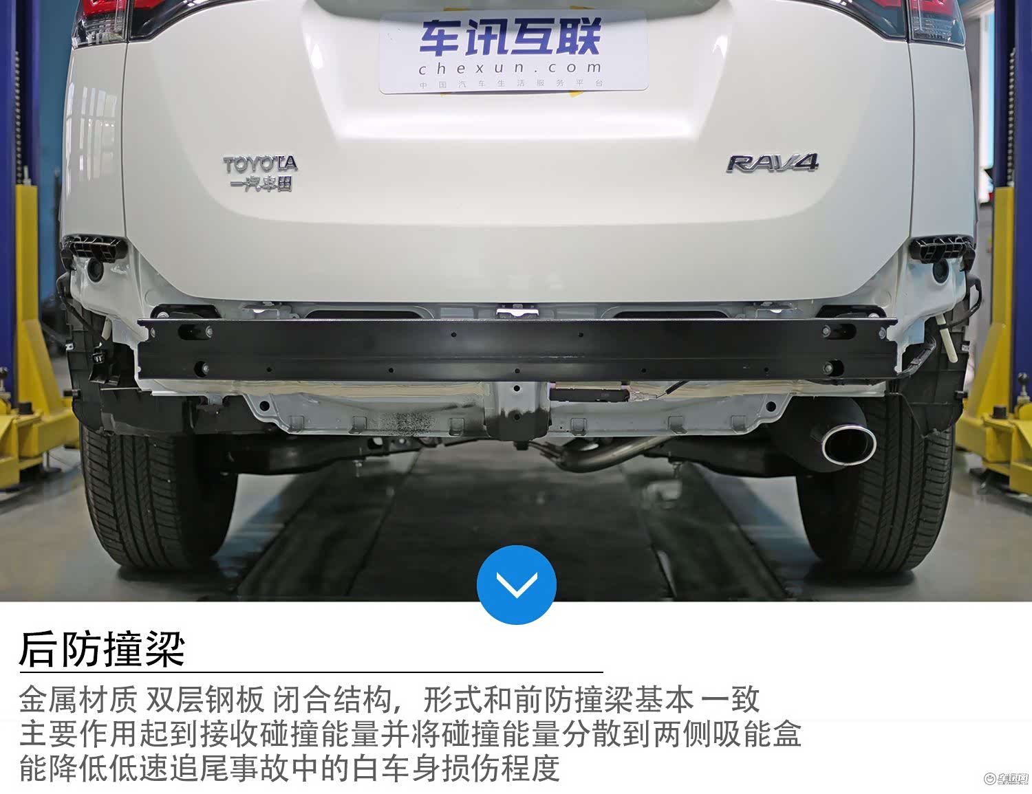 荣放后部防护结构的原理和前部相同,包括后保险杠、防撞梁、吸能盒、车身后部纵梁等组件。