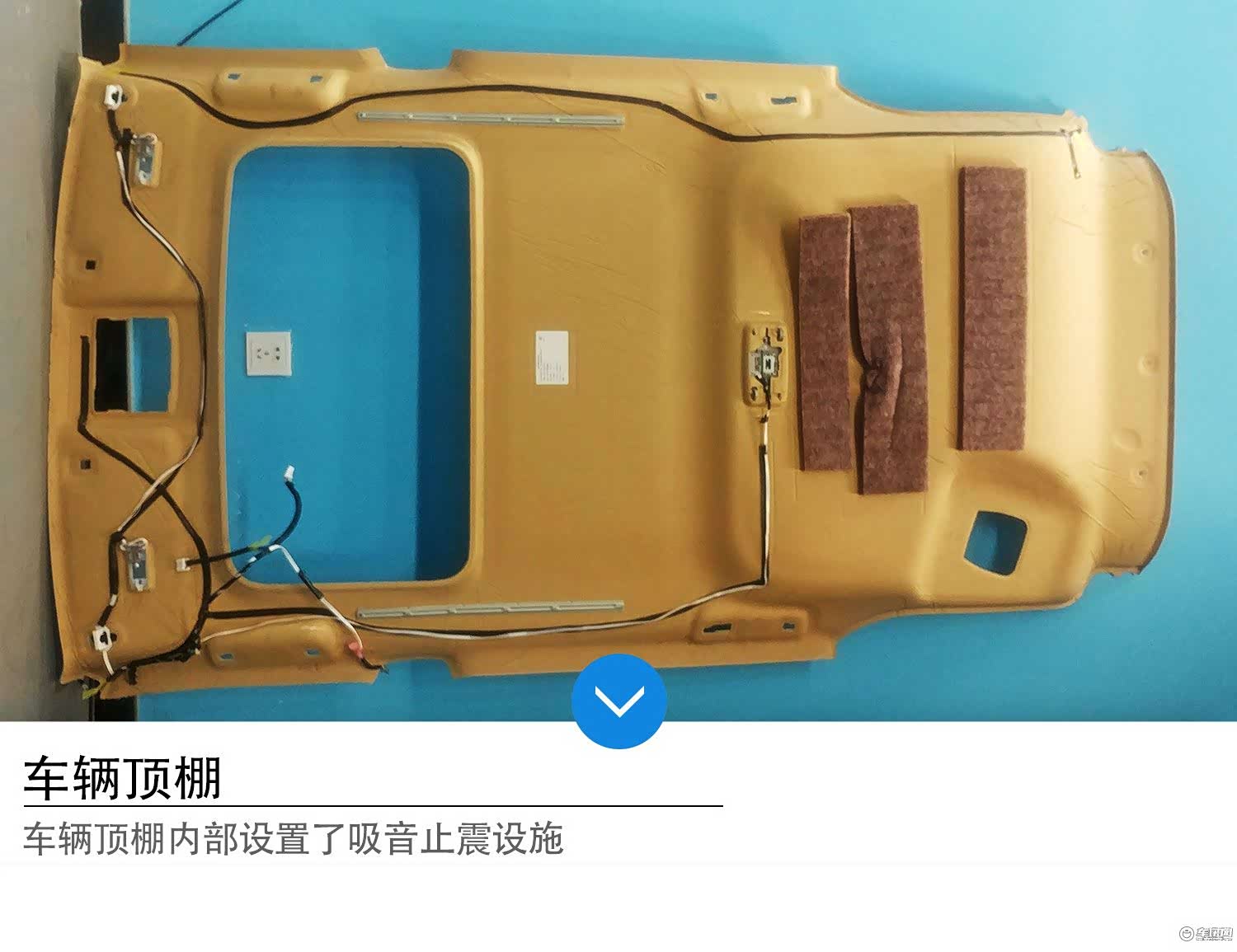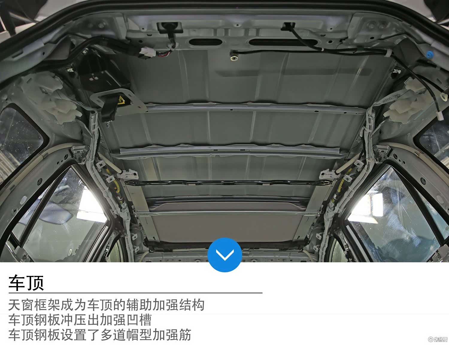 从上图中我们能看到车顶钢板冲压出多道凹槽,这有利于提升钢板本身强度,避免行驶中的震动导致噪音。