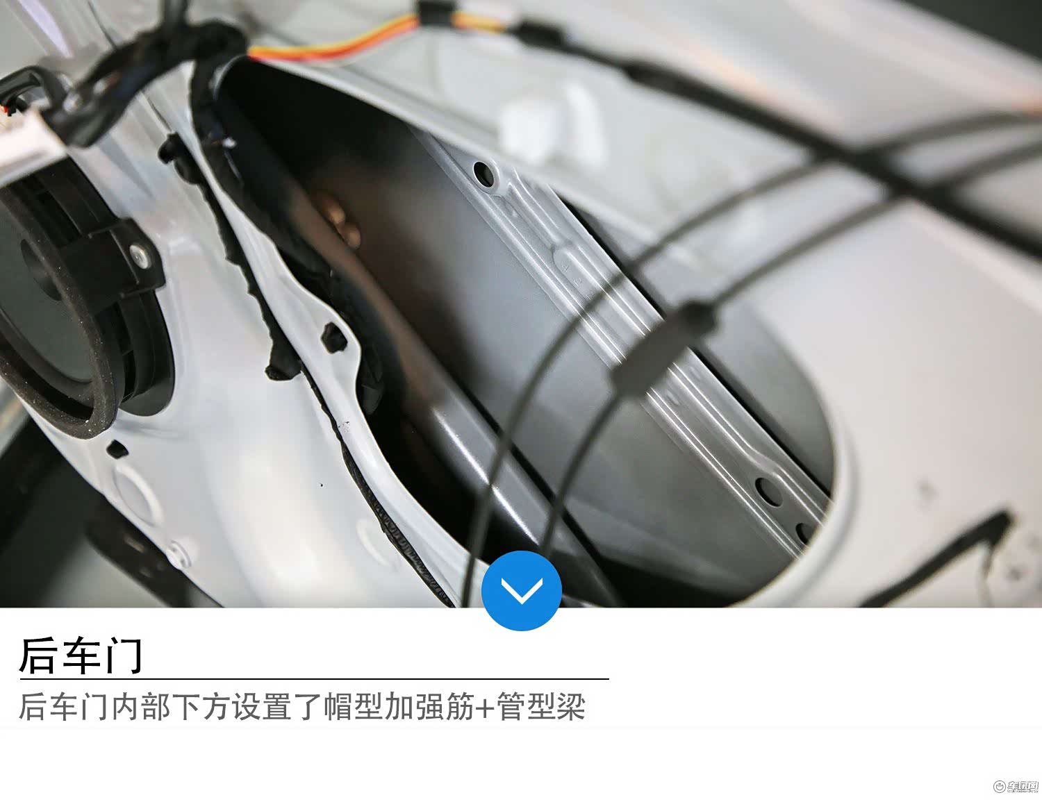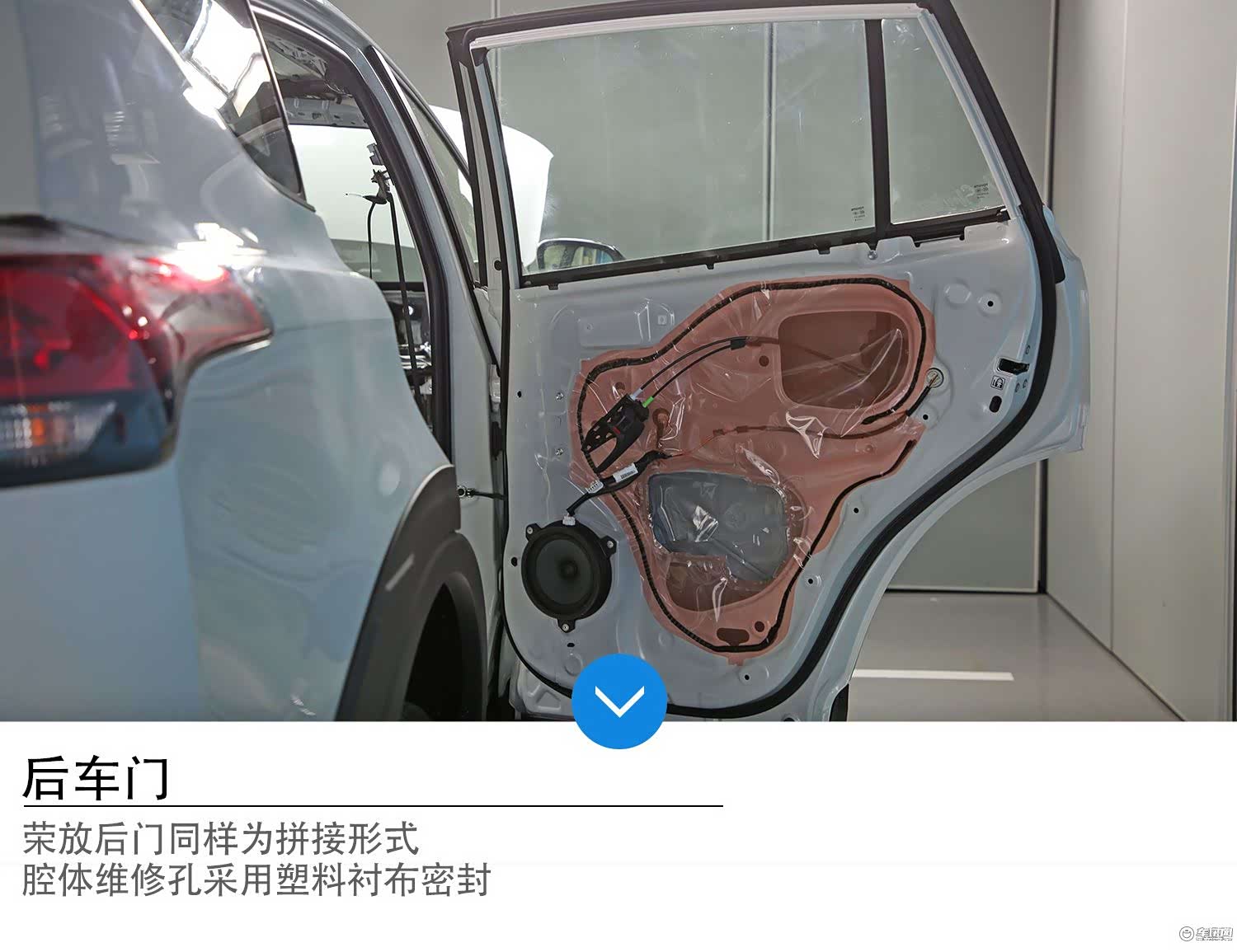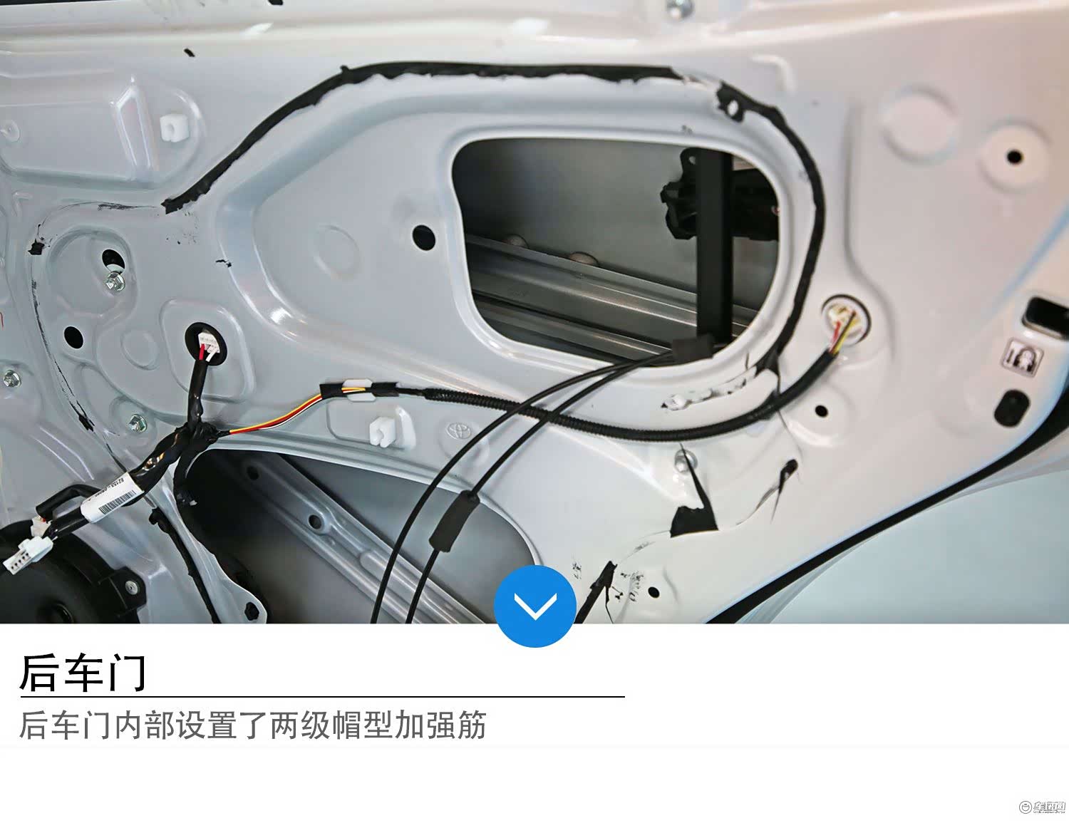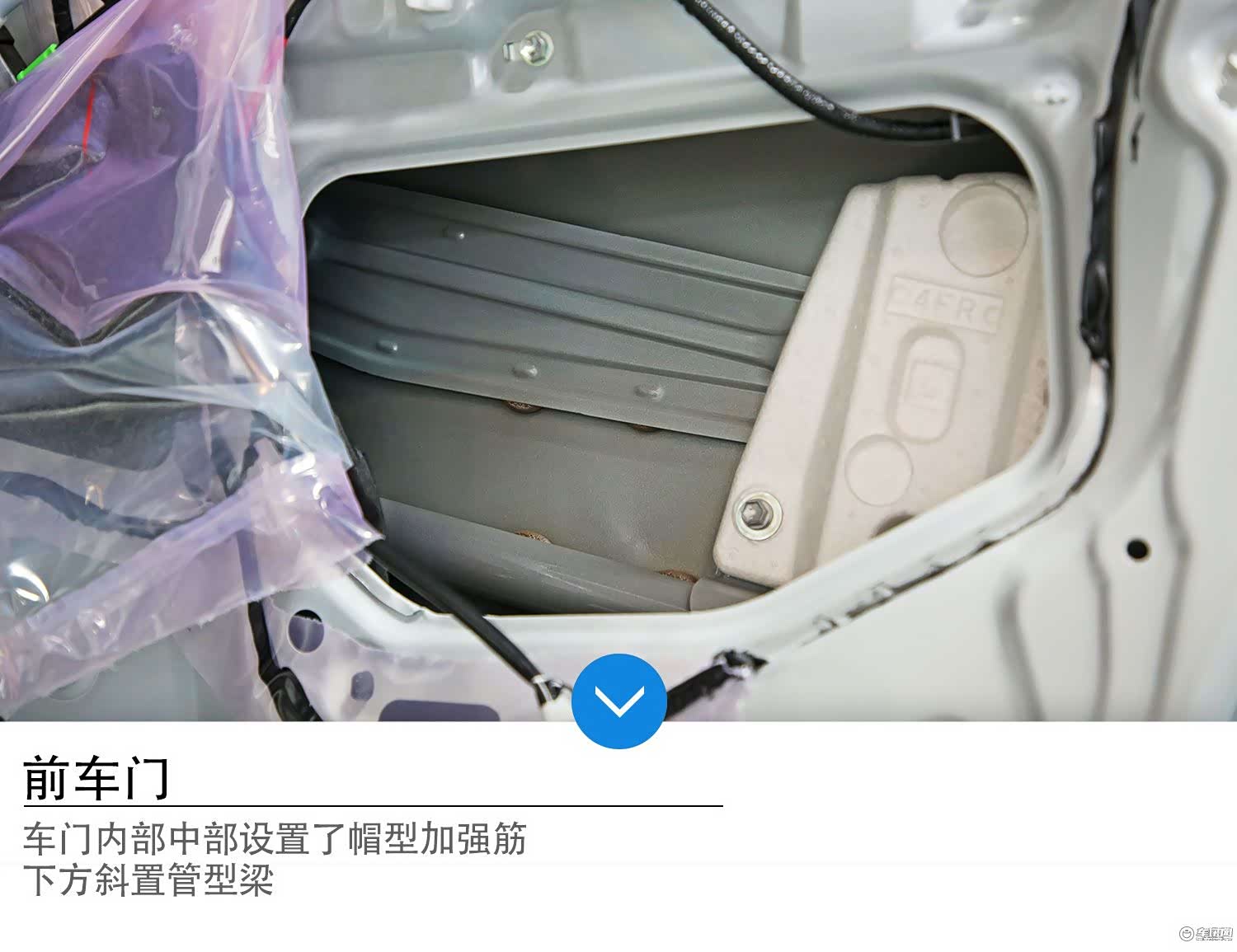荣放后车门同样为拼接形式,车门内置管型梁+两道帽型加强筋。