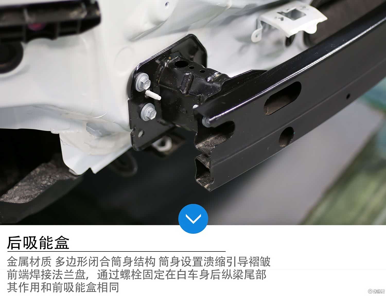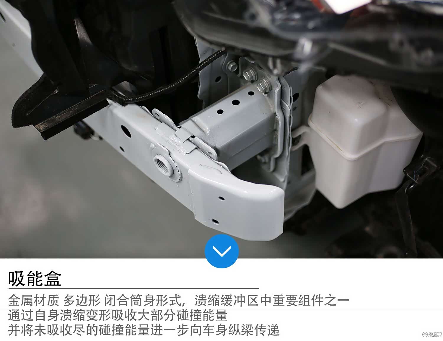 吸能盒,顾名思义就是为吸能设置的,在碰撞中通过牺牲自己,吸收大部分碰撞能量,并将未吸收尽的碰撞能量向车身纵梁传导。