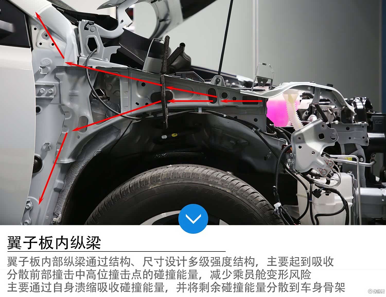 荣放在翼子板内部还设置了一根尺寸较长的盒式纵梁,主要用于高点碰撞能量的传递,纵梁通过多级强度设置,利用自身溃缩变形吸收大部分碰撞能量,并将剩余碰撞能量向后方A柱分散,以进一步引导碰撞能量向车身骨架传递和释放,降低乘员舱变形程度。