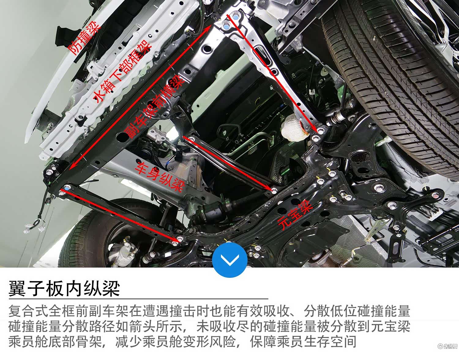 如上图所示,在前排乘客脚下,设置了斜置纵梁,连接左右B柱之间的横梁,在遭遇前部撞击,尤其是偏置碰撞时,该结构能有效分散、传递碰撞能量,减少乘员舱变形风险,降低车内乘员伤害。